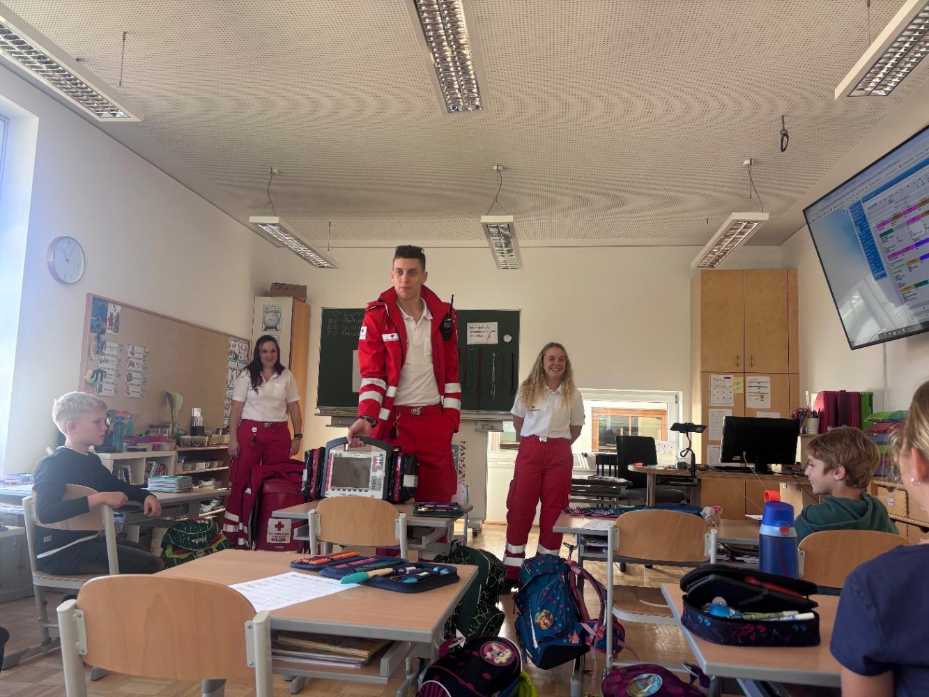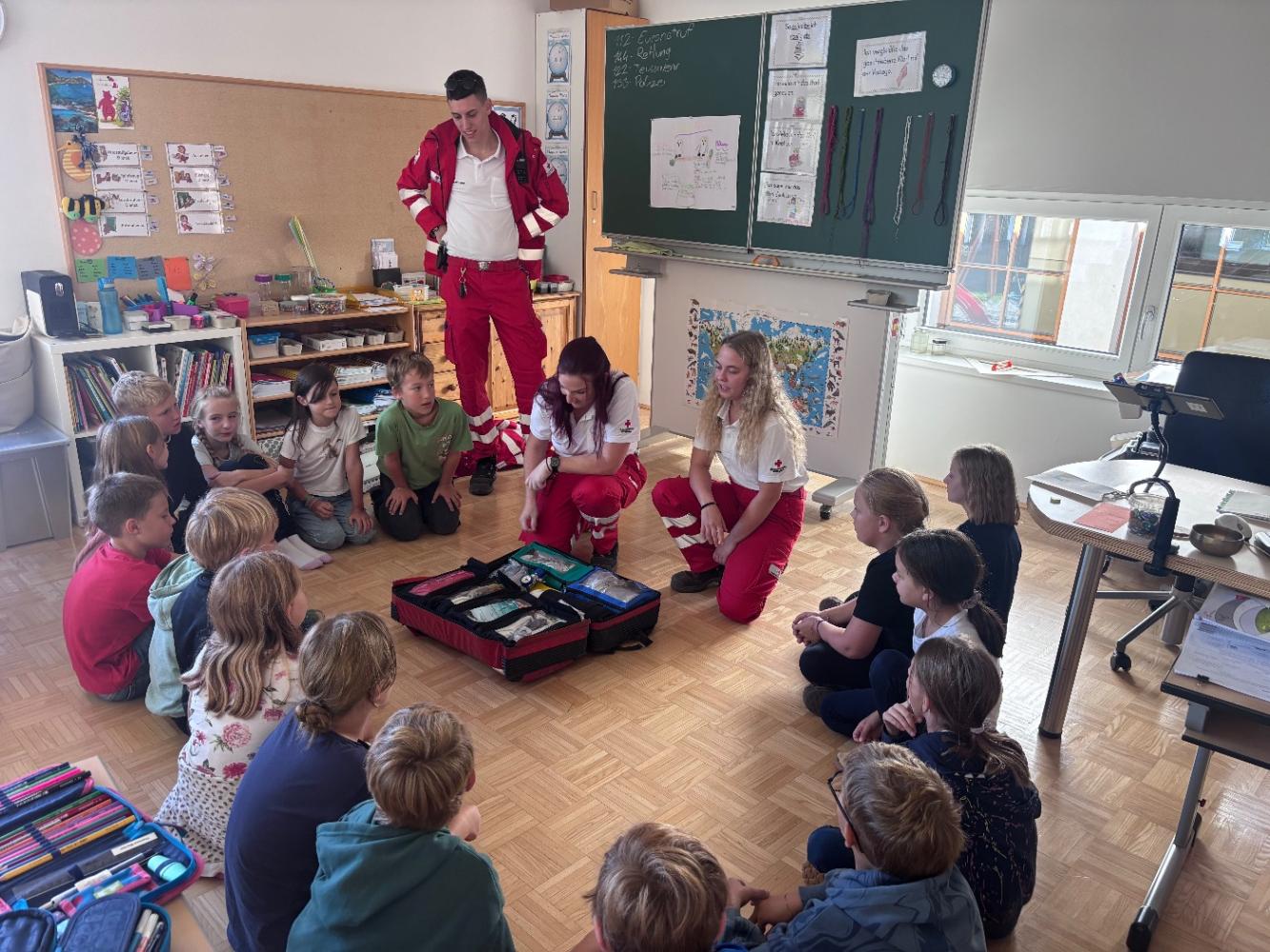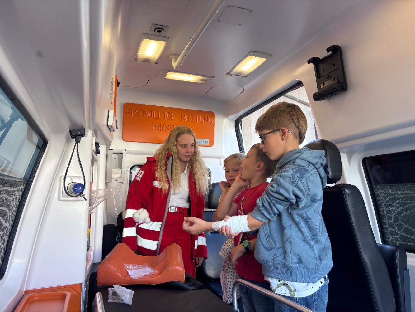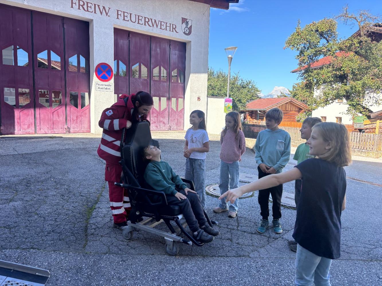 Jedes Kind aus den vier Klassen durfte das Team begrüßen, Fragen stellen und den Rettungskoffer kennenlernen. Einige haben ihren Puls gemessen, manche einen Verband oder ein Dreieckstuch umgebunden bekommen. Danach ging es in den Rettungswagen. Wir durften im Inneren auf der Liege liegen, das Blaulicht einschalten und im Tragesessel sitzen und ihn hineinschieben.