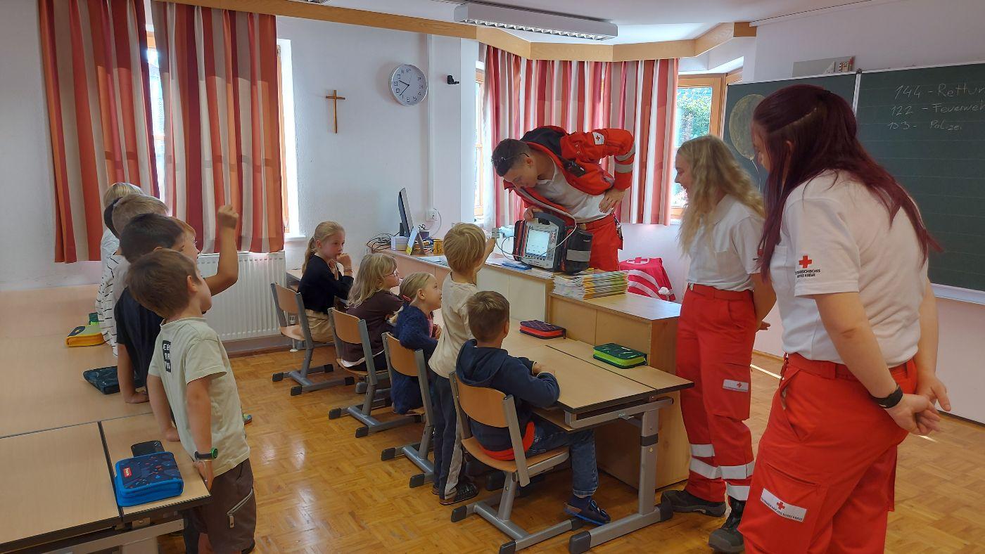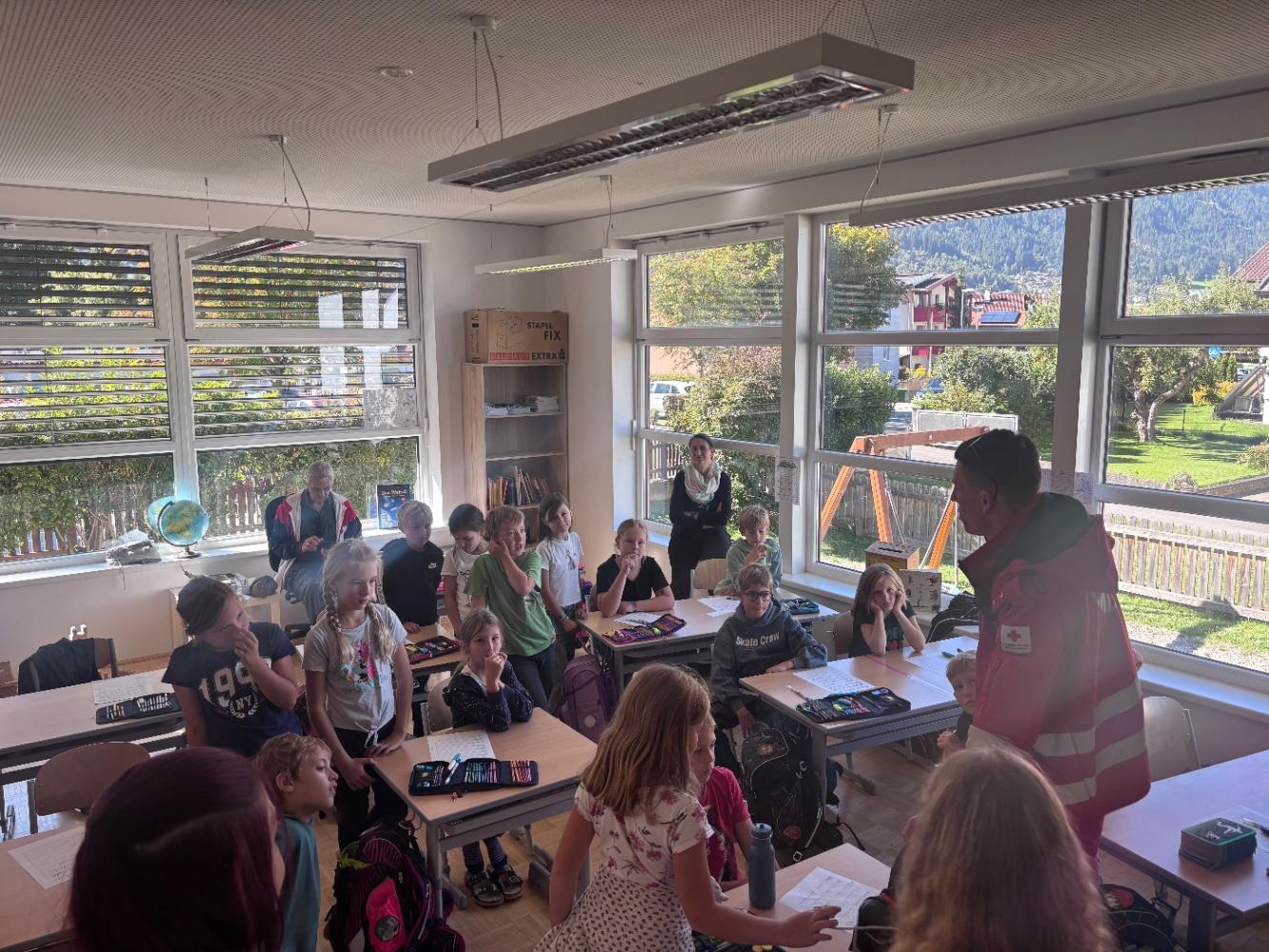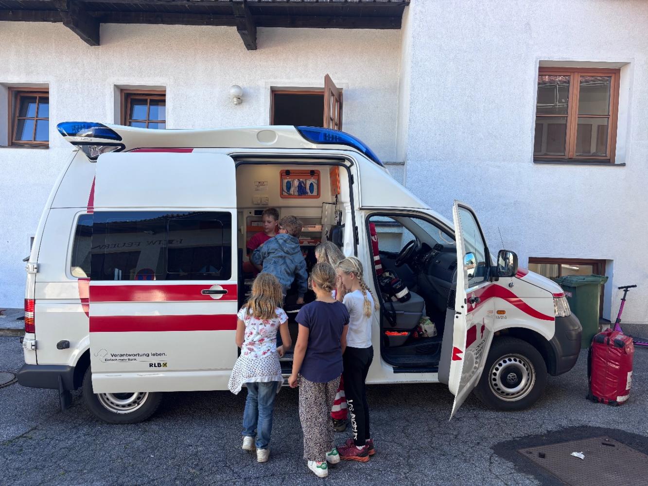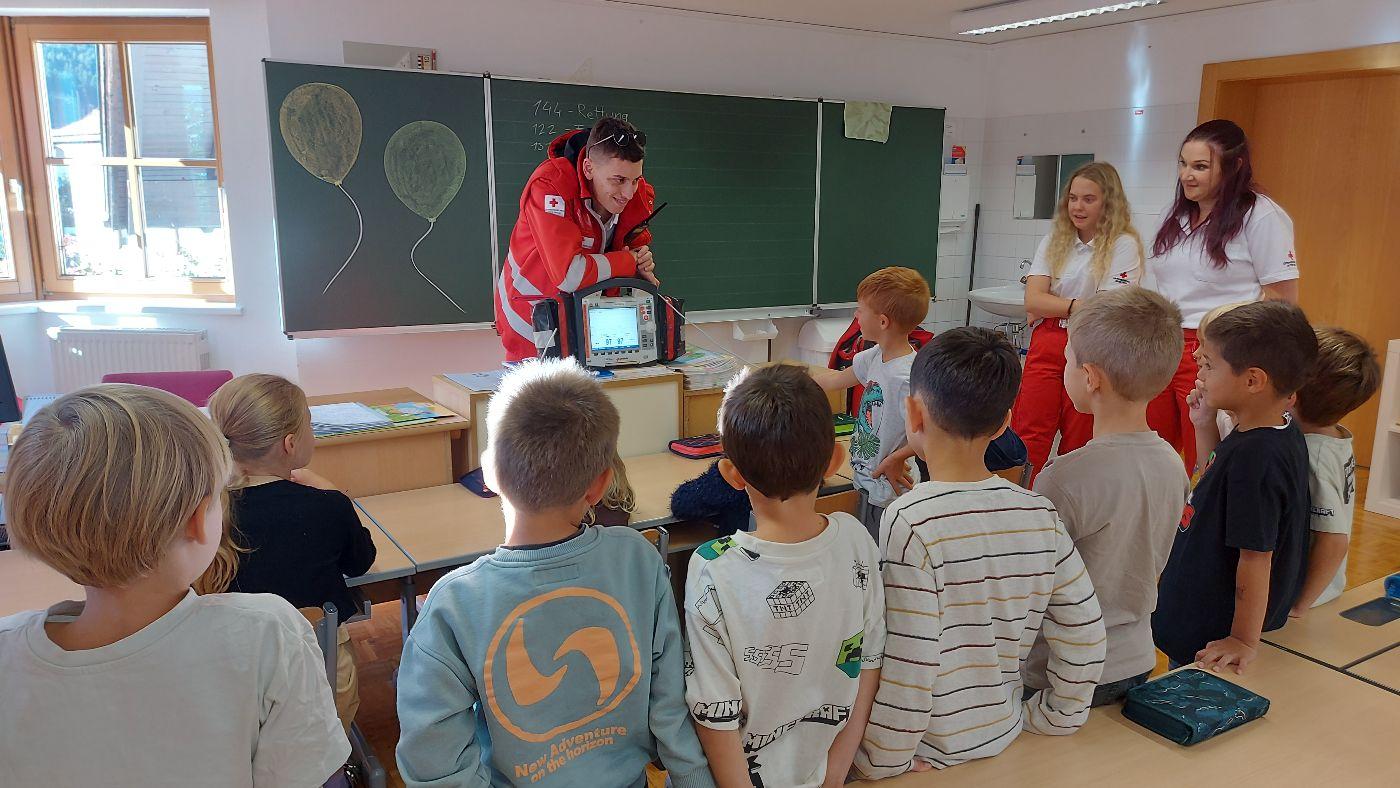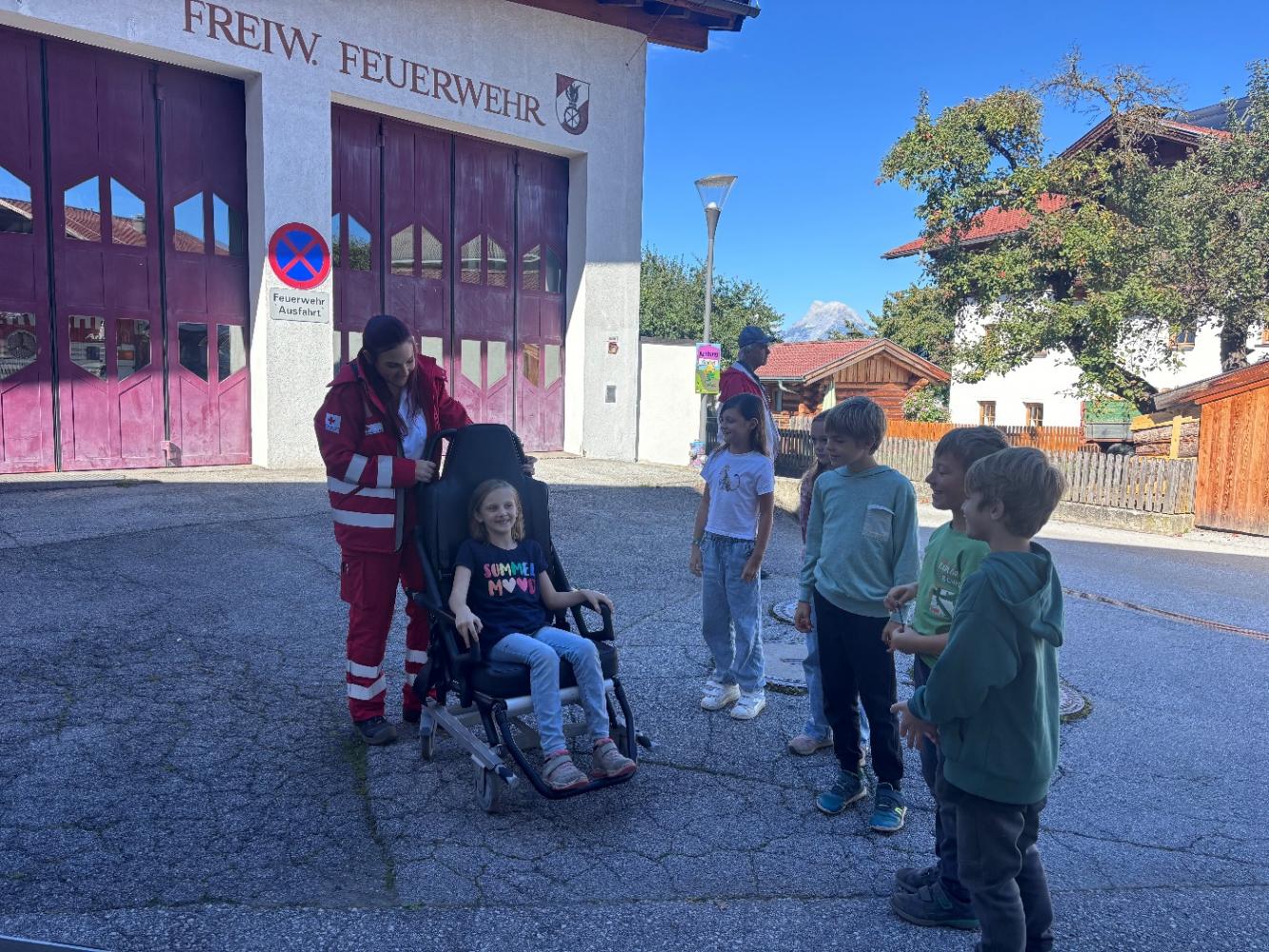 Jedes Kind aus den vier Klassen durfte das Team begrüßen, Fragen stellen und den Rettungskoffer kennenlernen. Einige haben ihren Puls gemessen, manche einen Verband oder ein Dreieckstuch umgebunden bekommen. Danach ging es in den Rettungswagen. Wir durften im Inneren auf der Liege liegen, das Blaulicht einschalten und im Tragesessel sitzen und ihn hineinschieben.