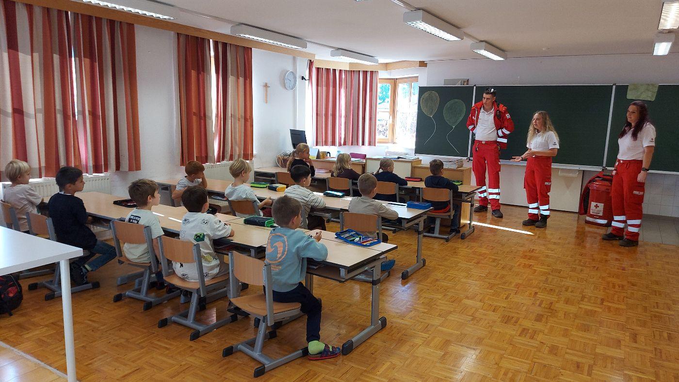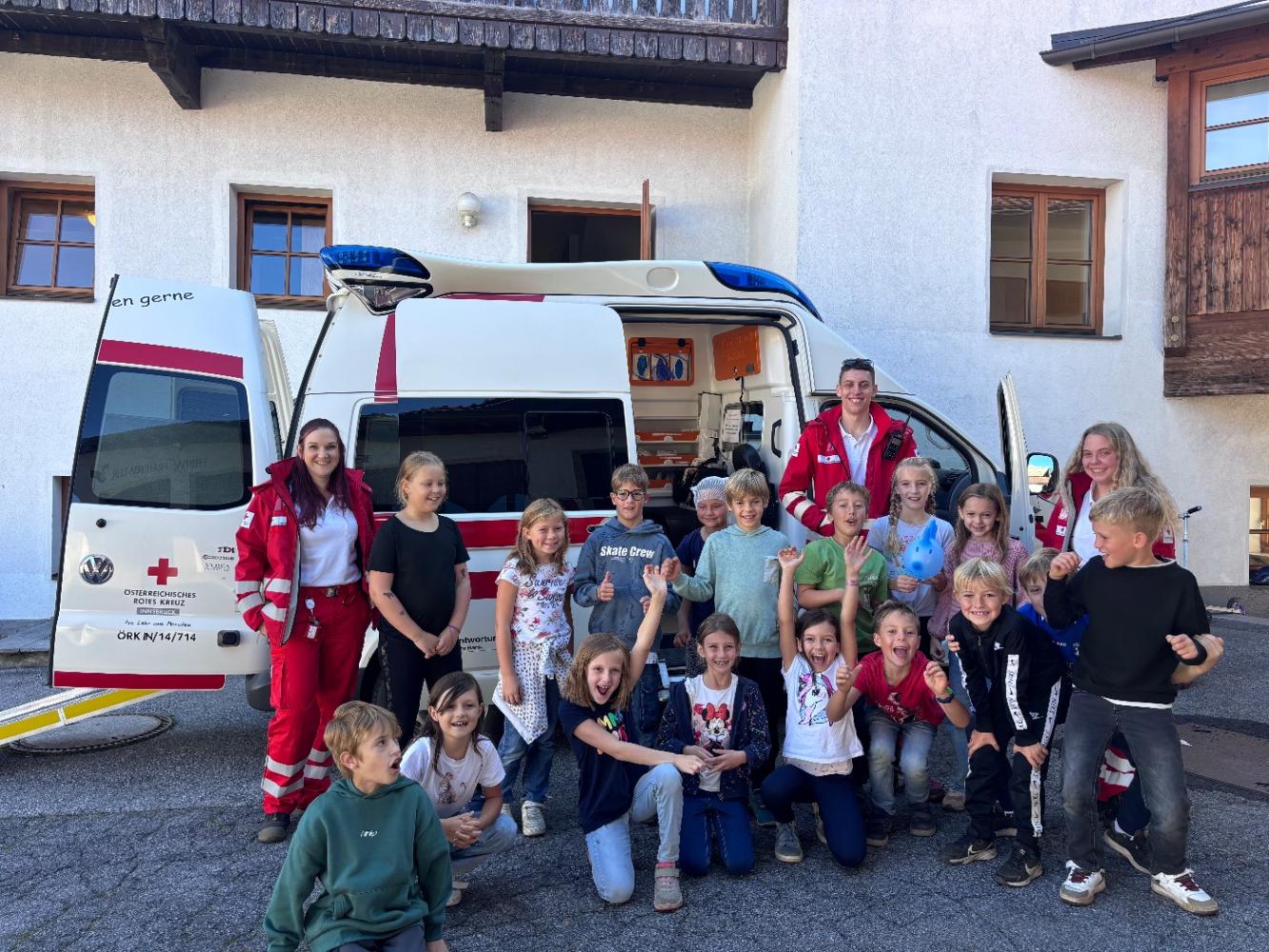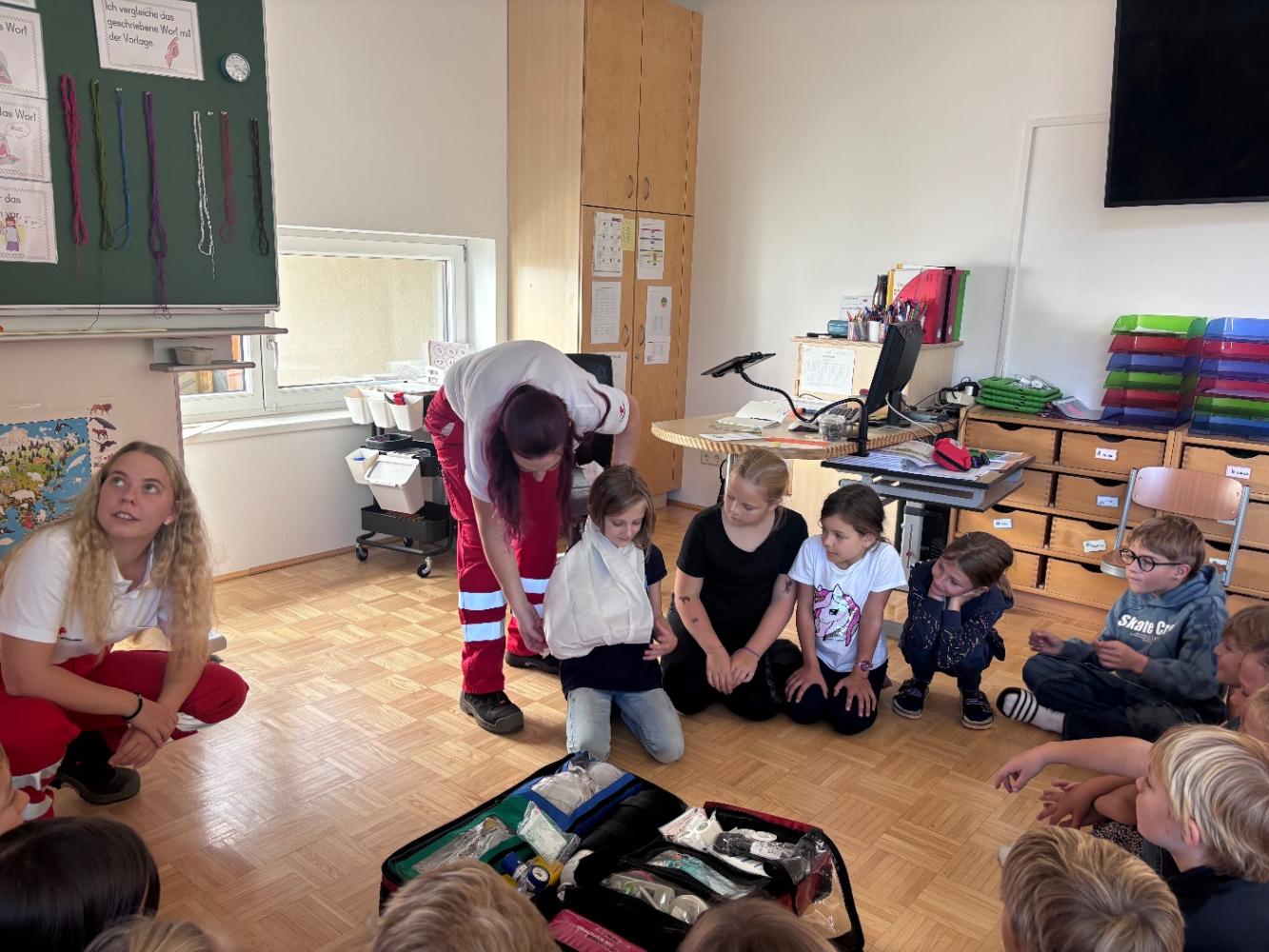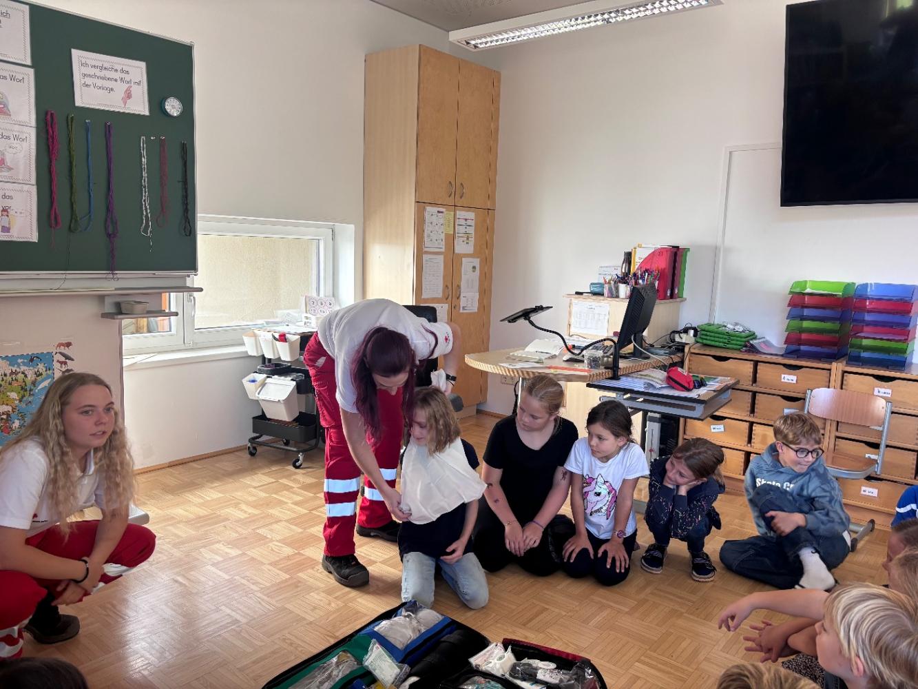Jedes Kind aus den vier Klassen durfte das Team begrüßen, Fragen stellen und den Rettungskoffer kennenlernen. Einige haben ihren Puls gemessen, manche einen Verband oder ein Dreieckstuch umgebunden bekommen. Danach ging es in den Rettungswagen. Wir durften im Inneren auf der Liege liegen, das Blaulicht einschalten und im Tragesessel sitzen und ihn hineinschieben.