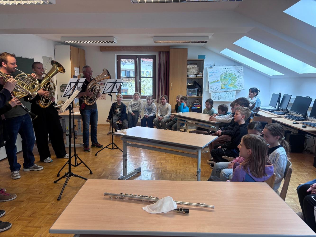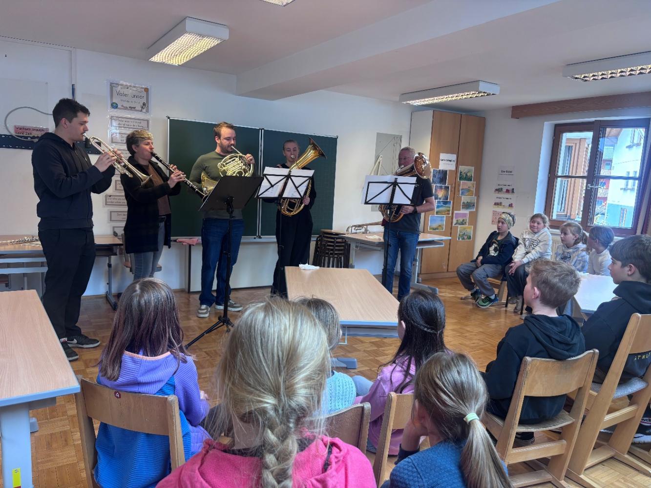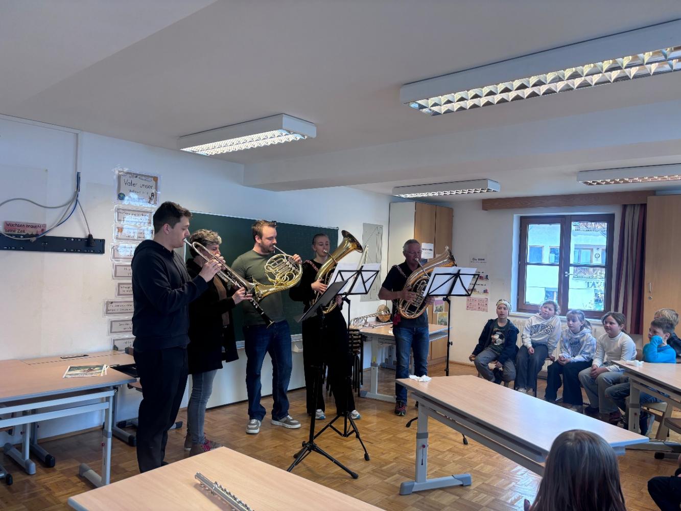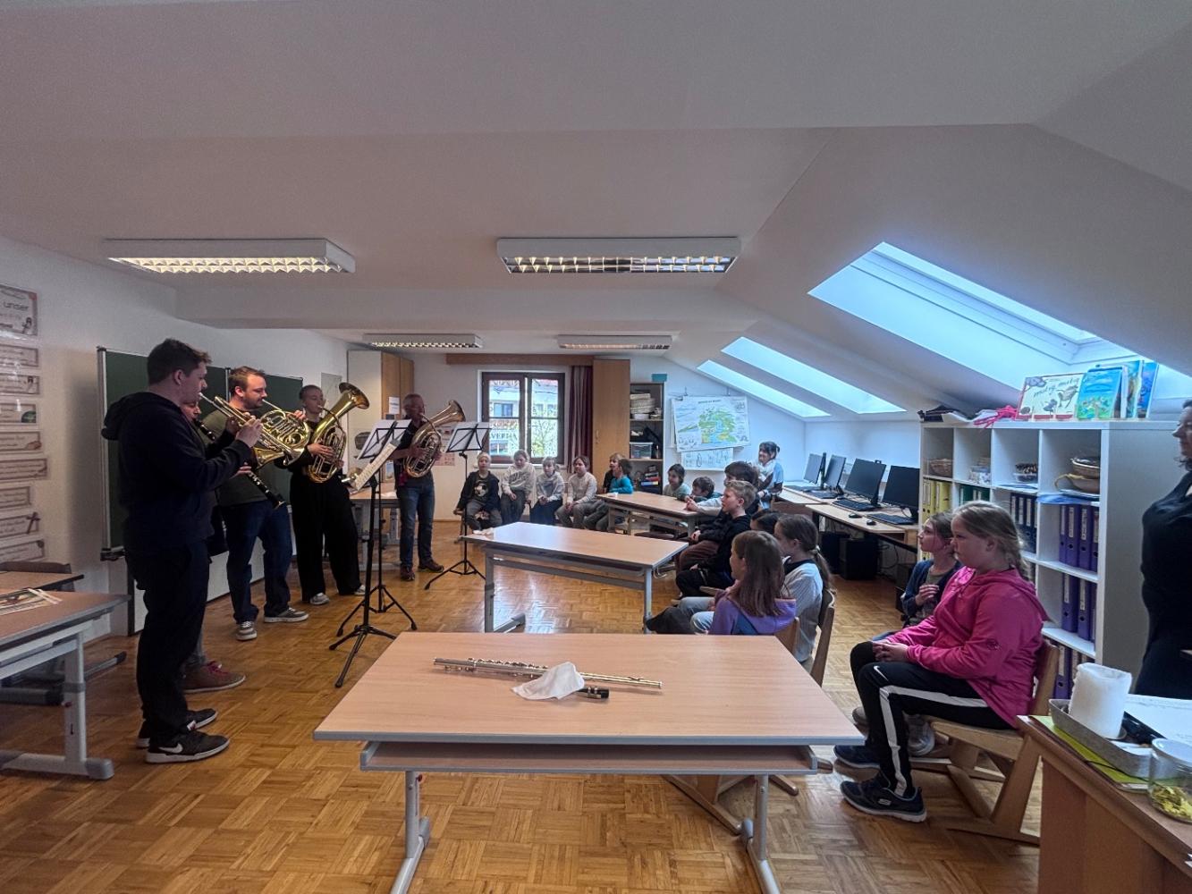 Die fünf Frauen und Herren brachten mit ihren Instrumenten unser Schulhaus zum Klingen und Beben. Nach einem ersten Musikstück, stellte jeder Musikant und jede Musikantin sich und das gespielte Musikinstrument vor. Anschließend spielten sie ein weiteres Stück „Seven Nation Army“, was für ein Klang bei uns im Haus.