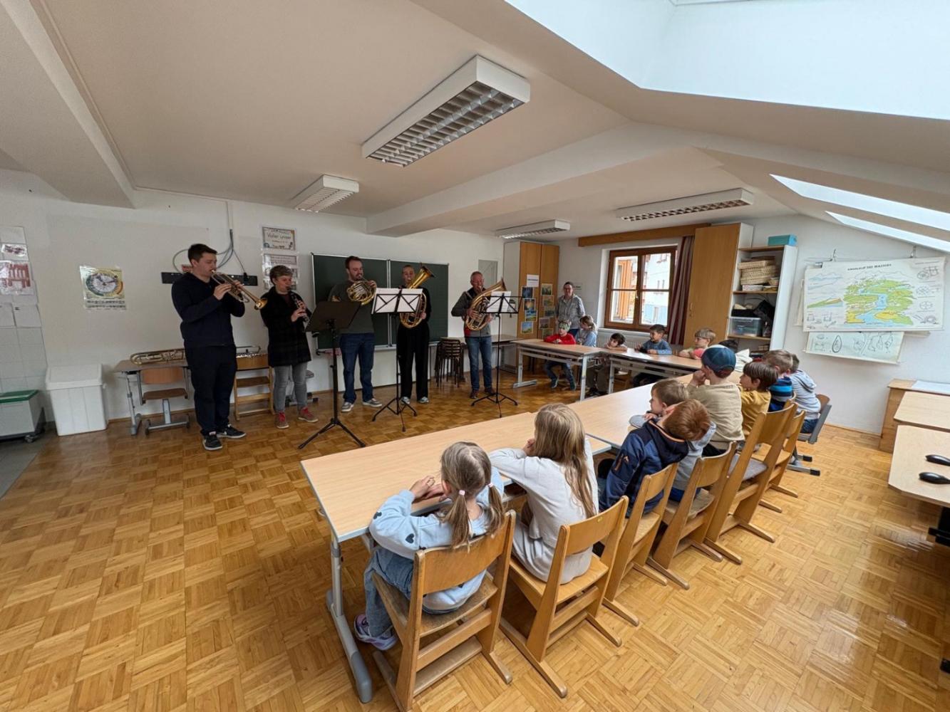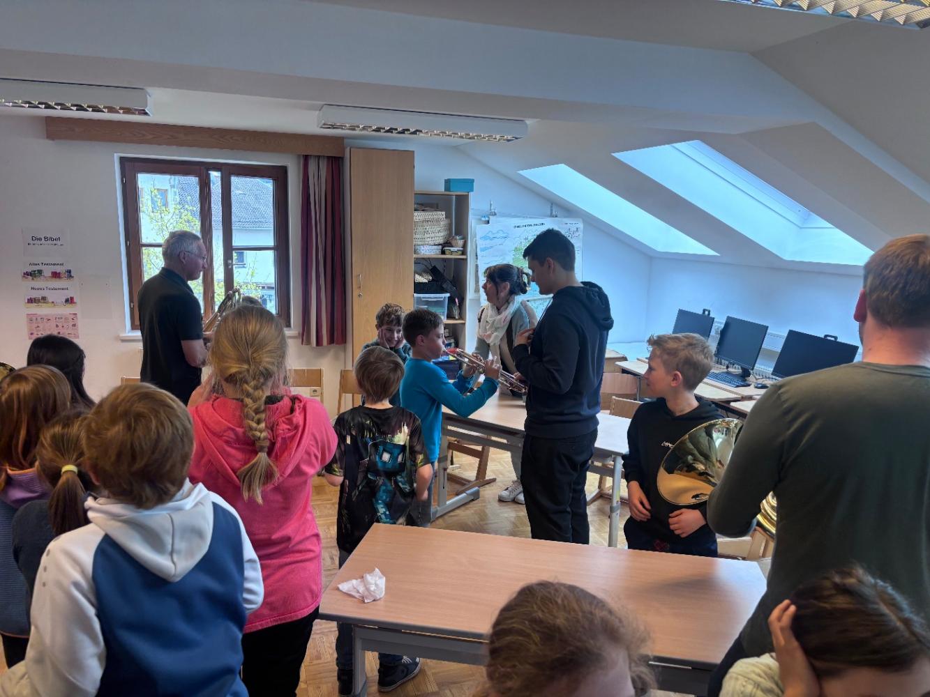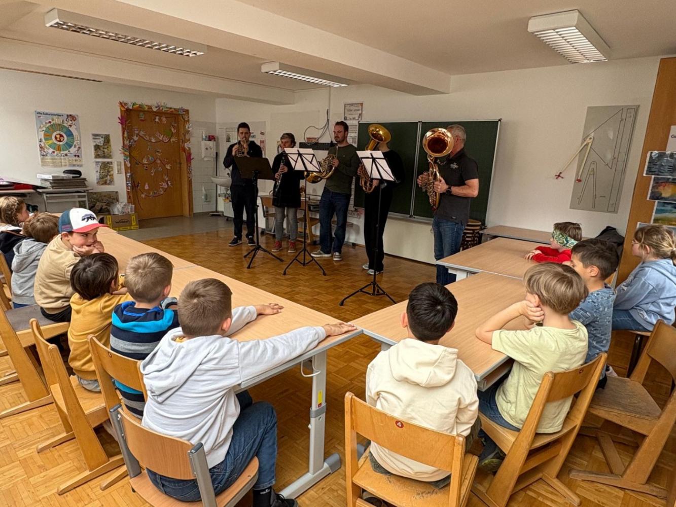 Die fünf Frauen und Herren brachten mit ihren Instrumenten unser Schulhaus zum Klingen und Beben. Nach einem ersten Musikstück, stellte jeder Musikant und jede Musikantin sich und das gespielte Musikinstrument vor. Anschließend spielten sie ein weiteres Stück „Seven Nation Army“, was für ein Klang bei uns im Haus.