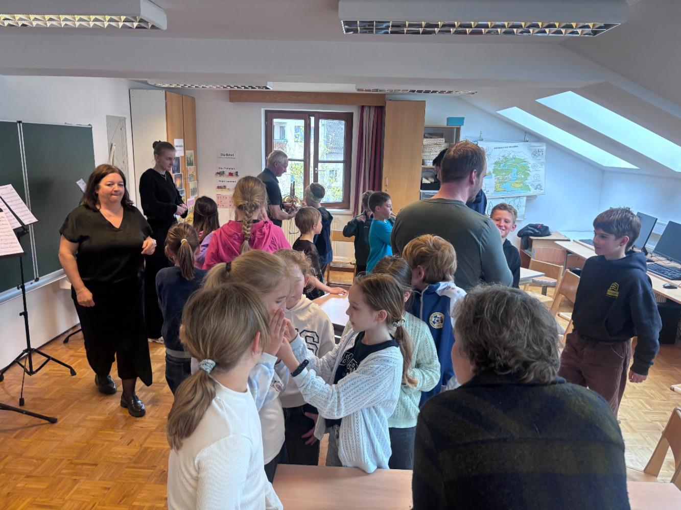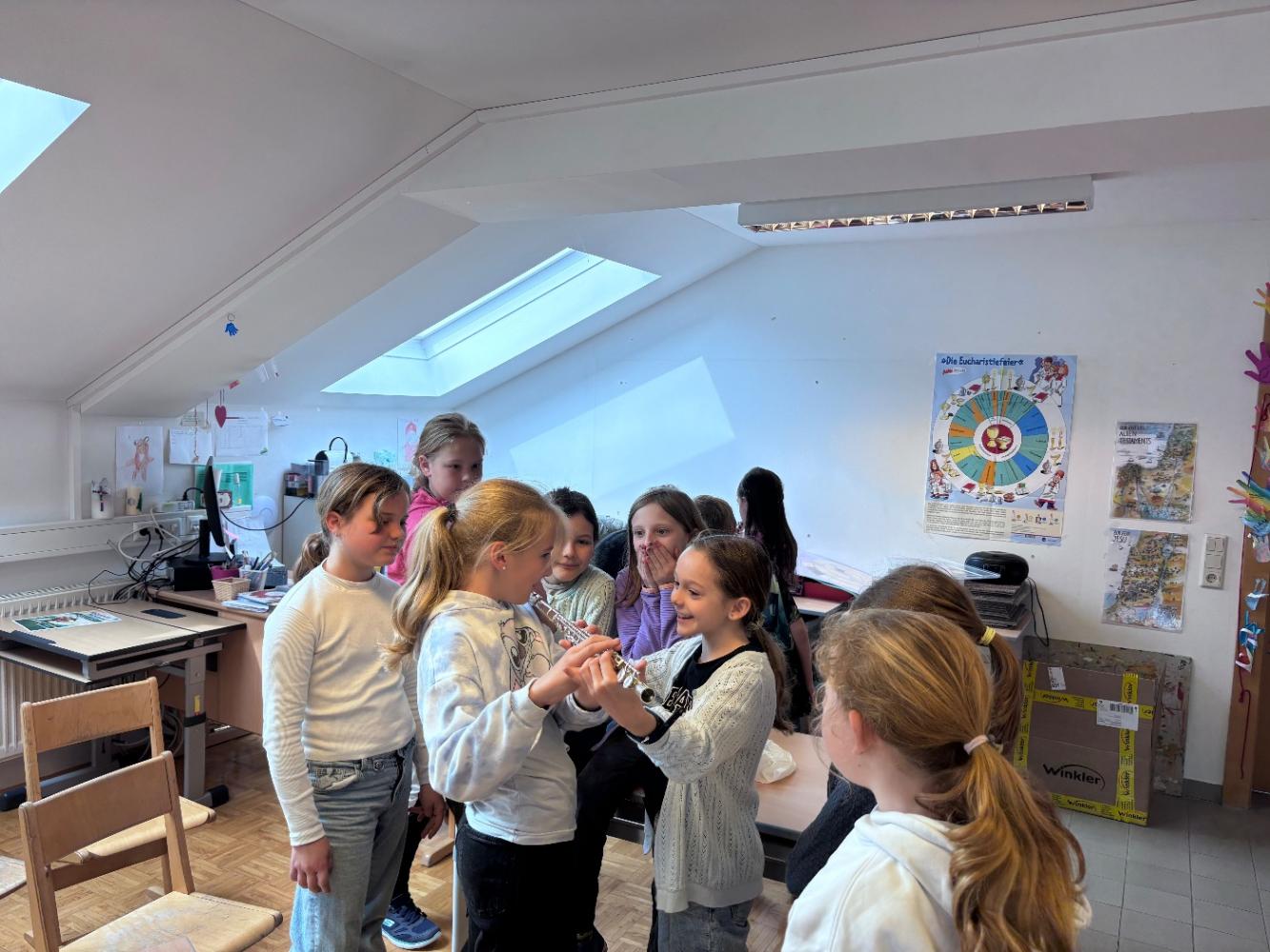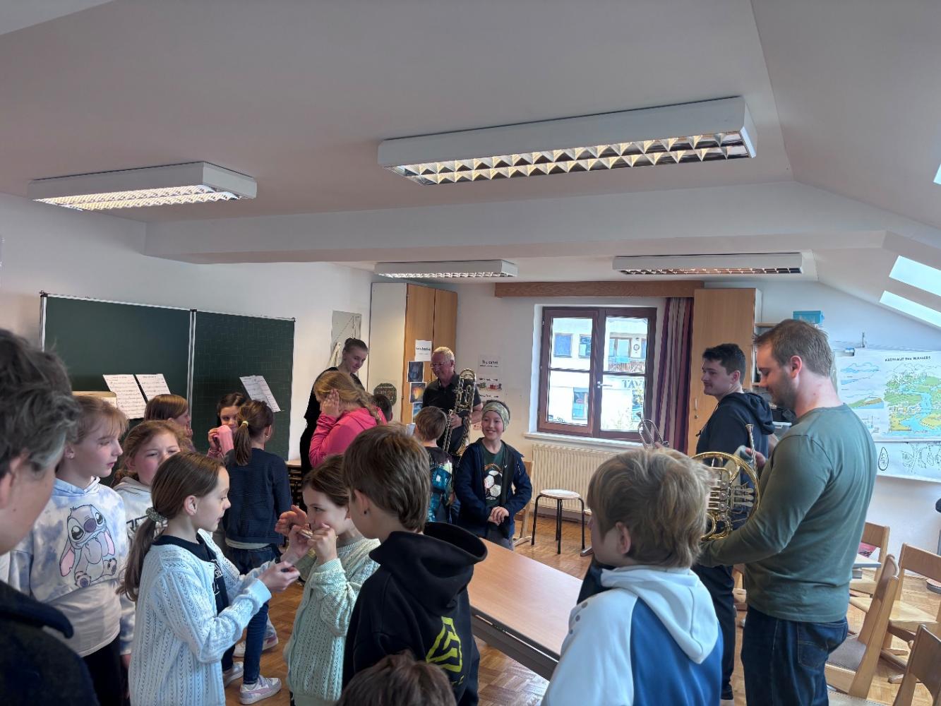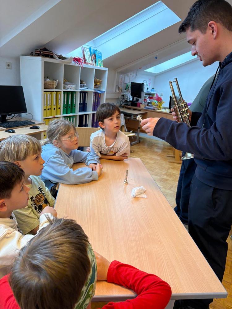 Die fünf Frauen und Herren brachten mit ihren Instrumenten unser Schulhaus zum Klingen und Beben. Nach einem ersten Musikstück, stellte jeder Musikant und jede Musikantin sich und das gespielte Musikinstrument vor. Anschließend spielten sie ein weiteres Stück „Seven Nation Army“, was für ein Klang bei uns im Haus.
