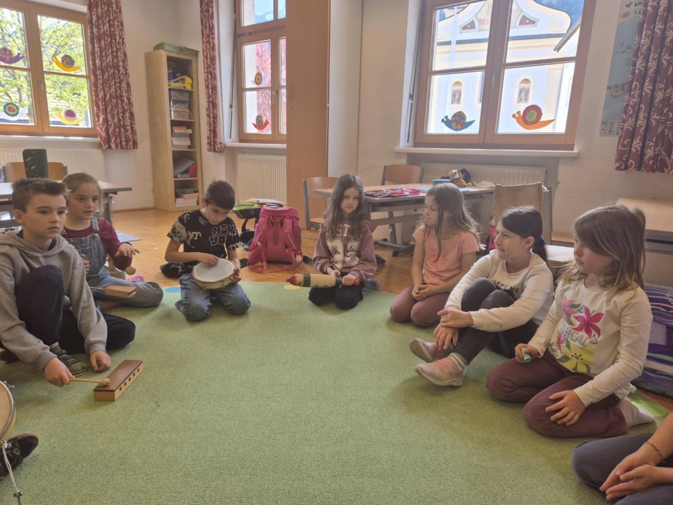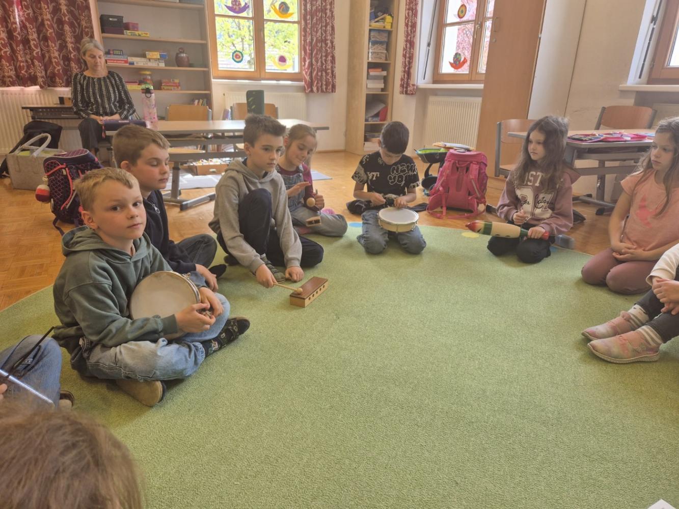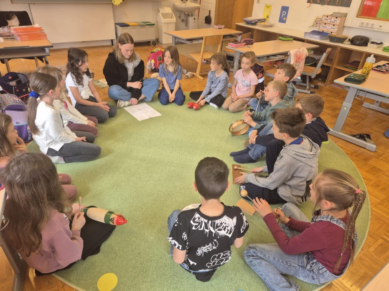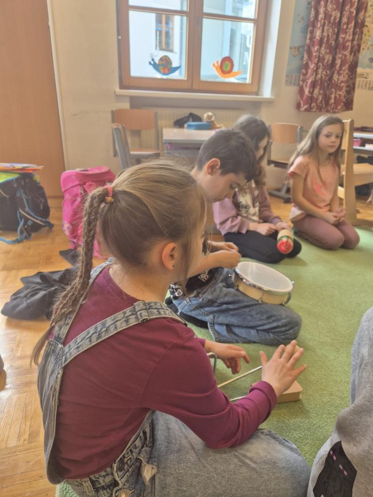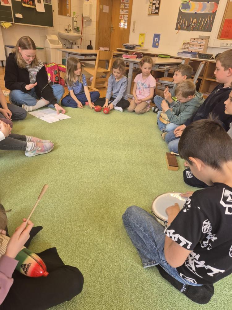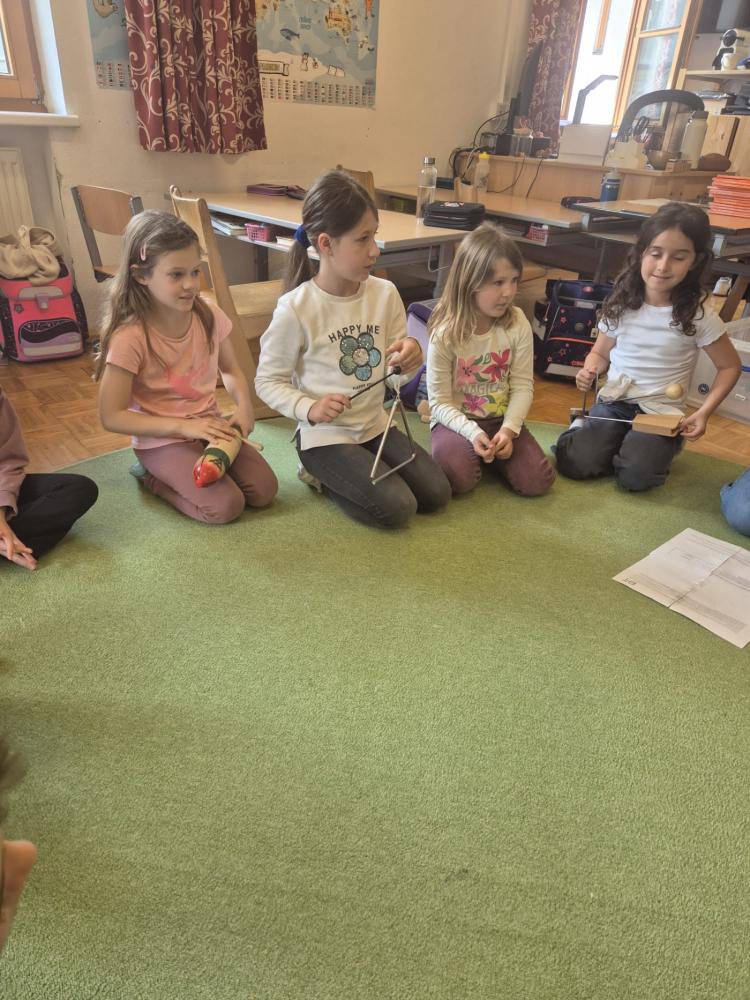 Besonders toll fanden wir die Musikstunde. Mit Instrumenten durften wir eine Klanggeschichte mitgestalten. Das war großartig!