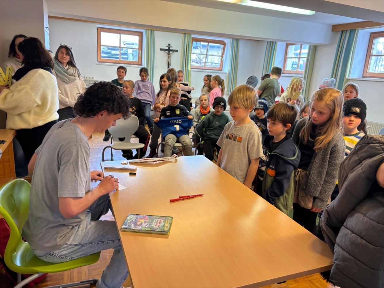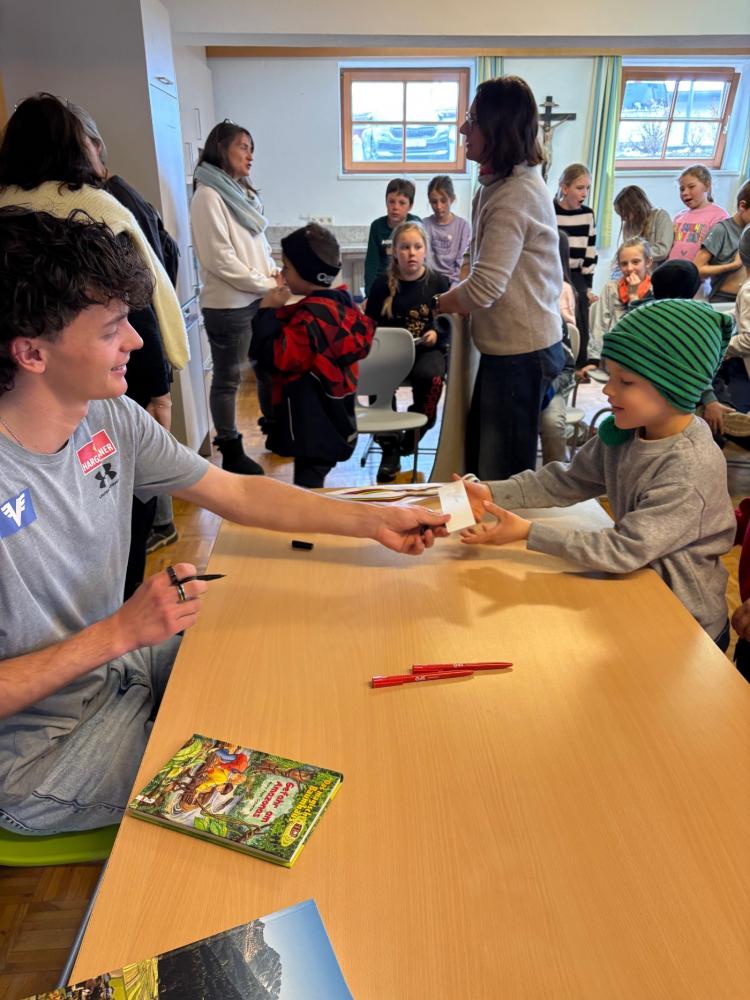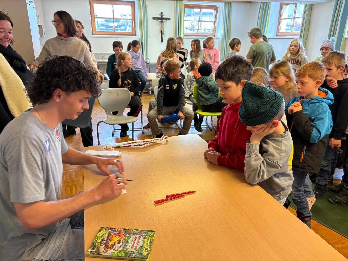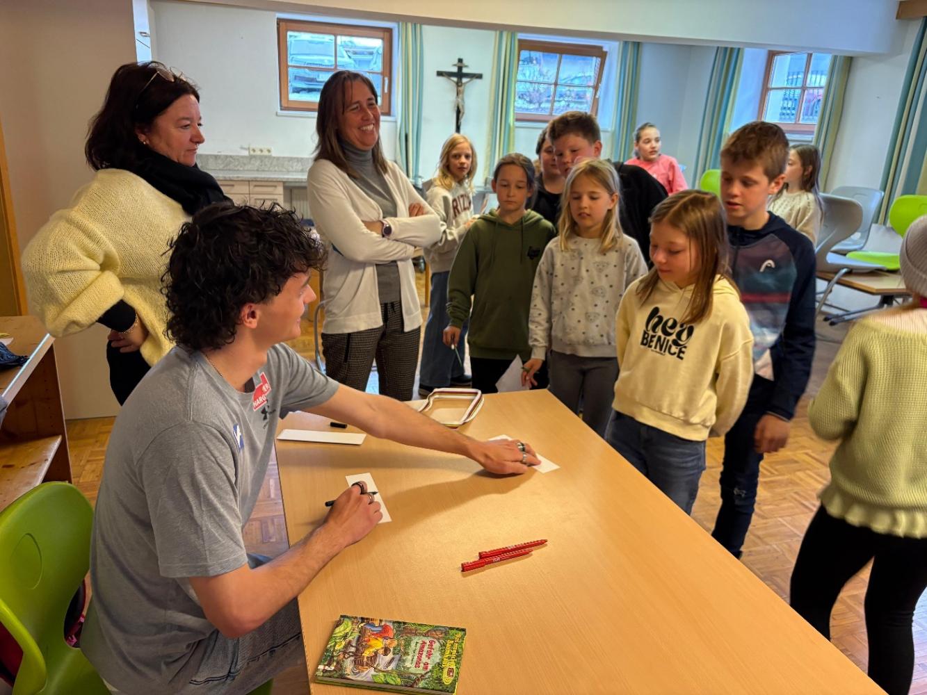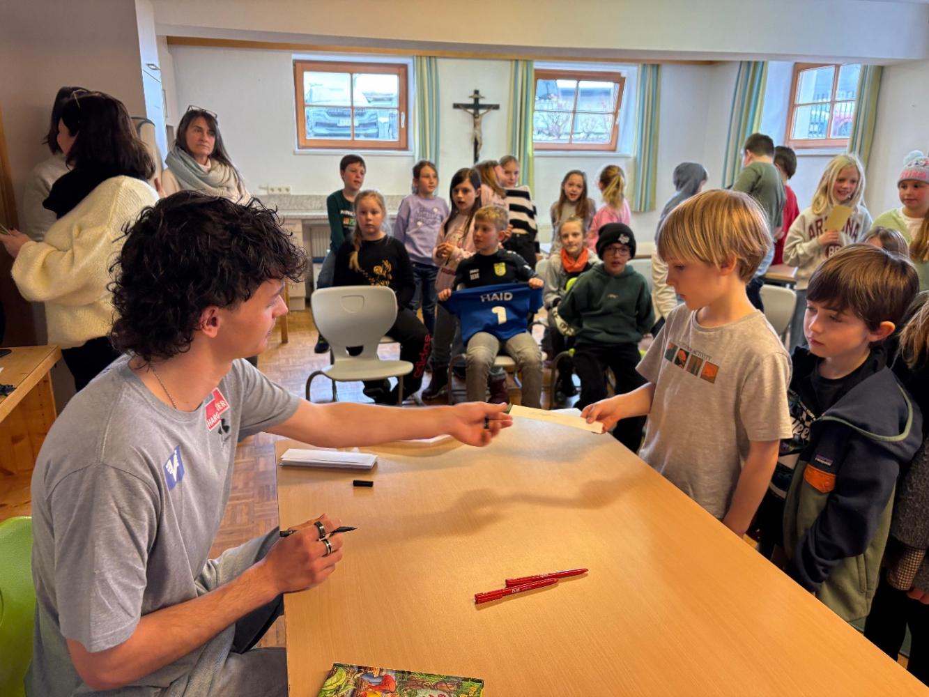 Elias Medwed ein österreichischer Skispringer, der selbst aus Birgitz stammt, besuchte uns an der Schule, las uns vor und zeigte uns wie die richtige Sprungpose aussieht. Wie cool und spannend! Natürlich staubten wir noch ein Autogramm ab und durften Fragen stellen.