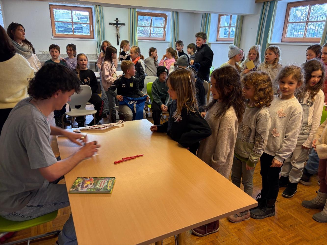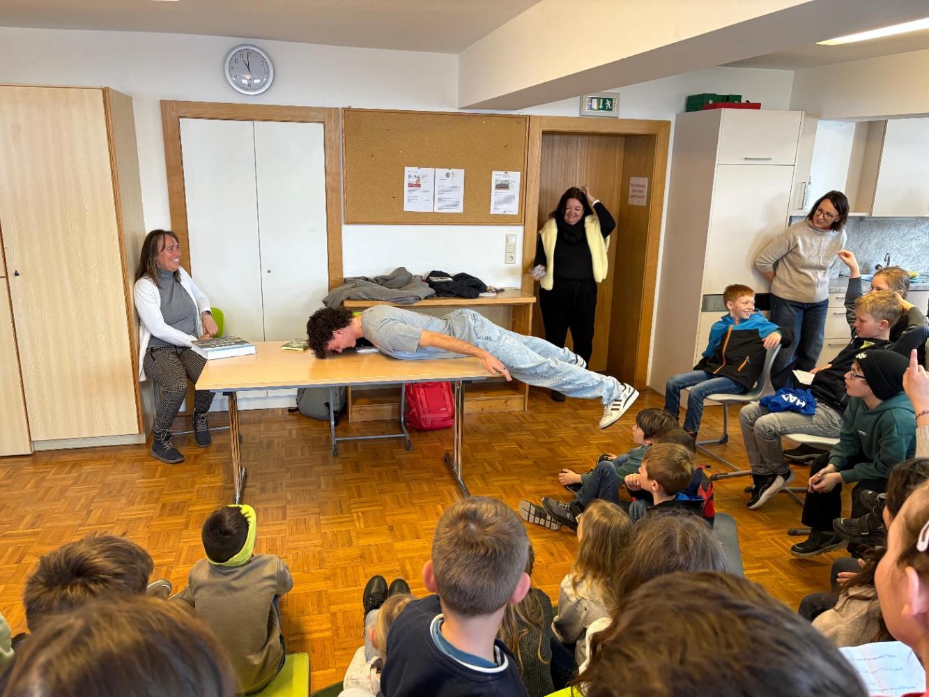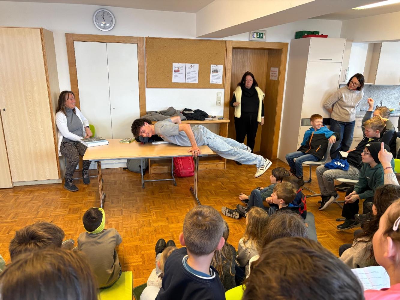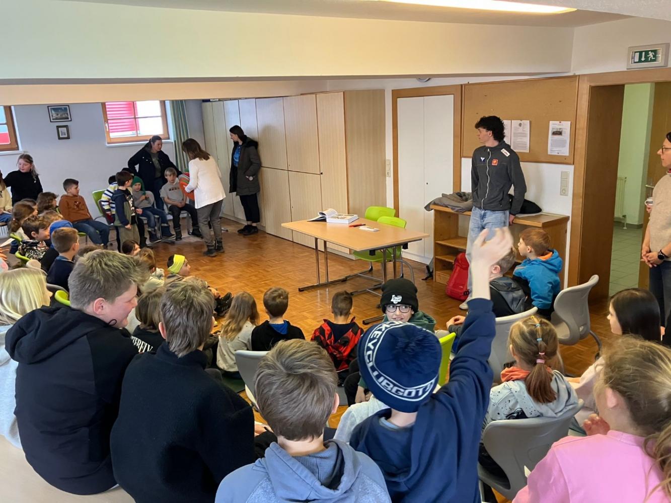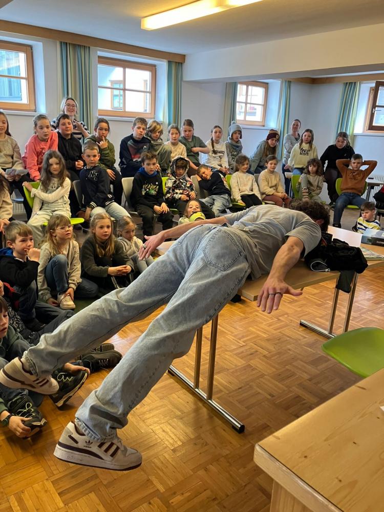 Elias Medwed ein österreichischer Skispringer, der selbst aus Birgitz stammt, besuchte uns an der Schule, las uns vor und zeigte uns wie die richtige Sprungpose aussieht. Wie cool und spannend! Natürlich staubten wir noch ein Autogramm ab und durften Fragen stellen.