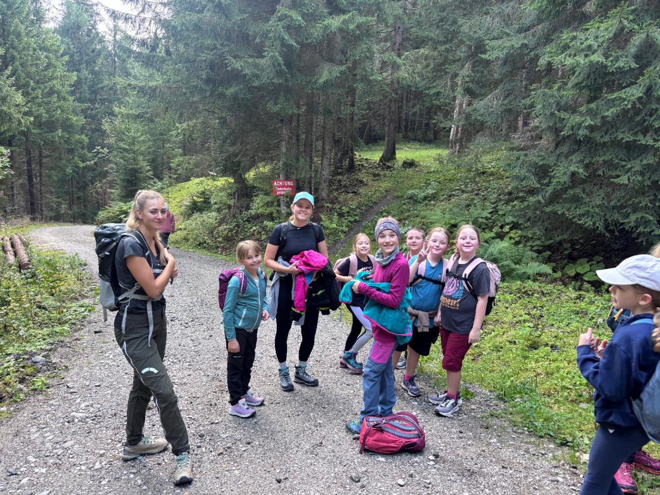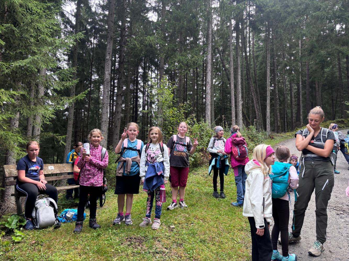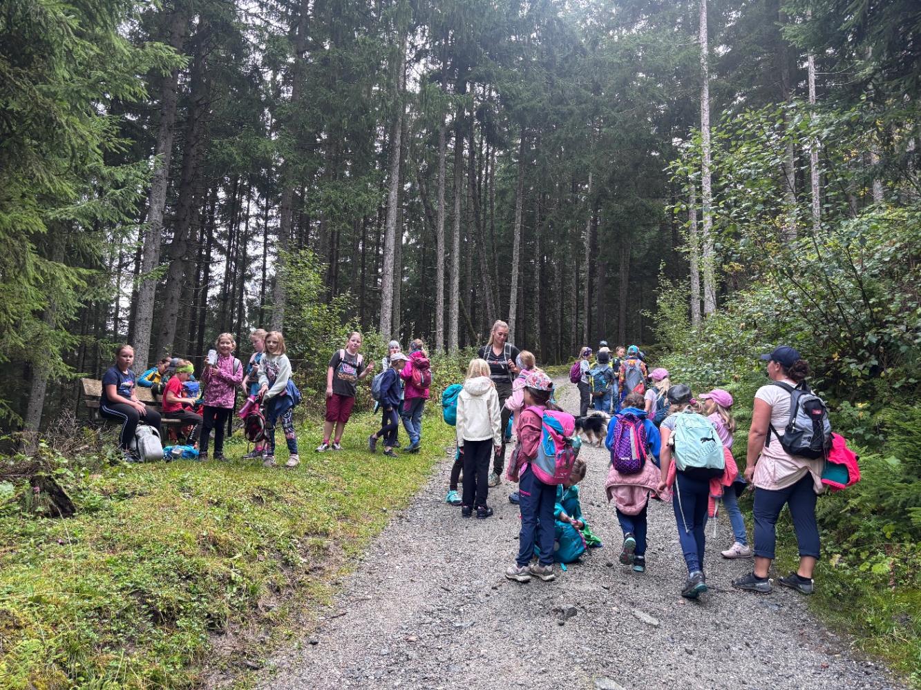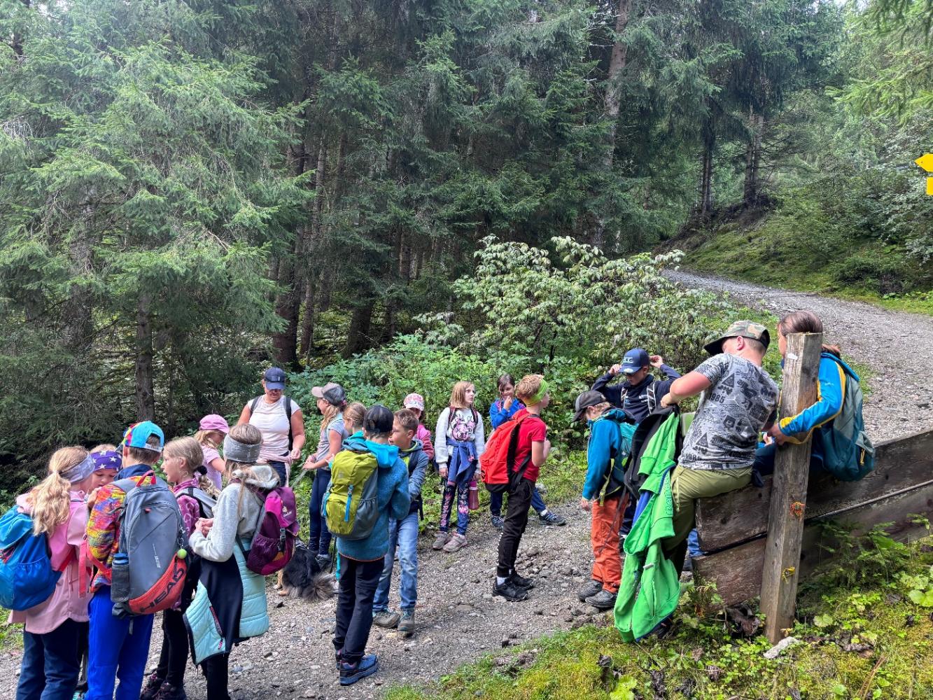 Gemeinsam haben wir uns auf den Weg zum Adelshof gemacht. In mystischer Stimmung begannen wir unseren Wandertag quer durchs Dorf, vorbei am Kindergarten zum Forstweg. Fröhlichen Gemüts mit haariger Begleitung, der Fellnase „Fanny“, wanderten wir gemütlich mit Pausen, stetig bergauf unserem Ziel entgegen.
