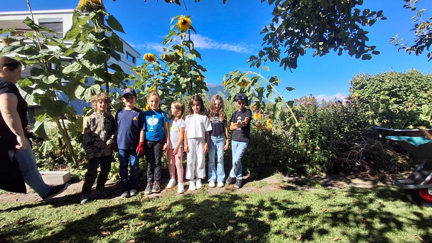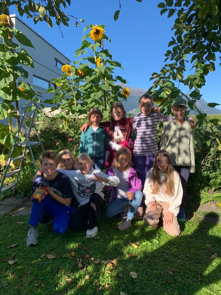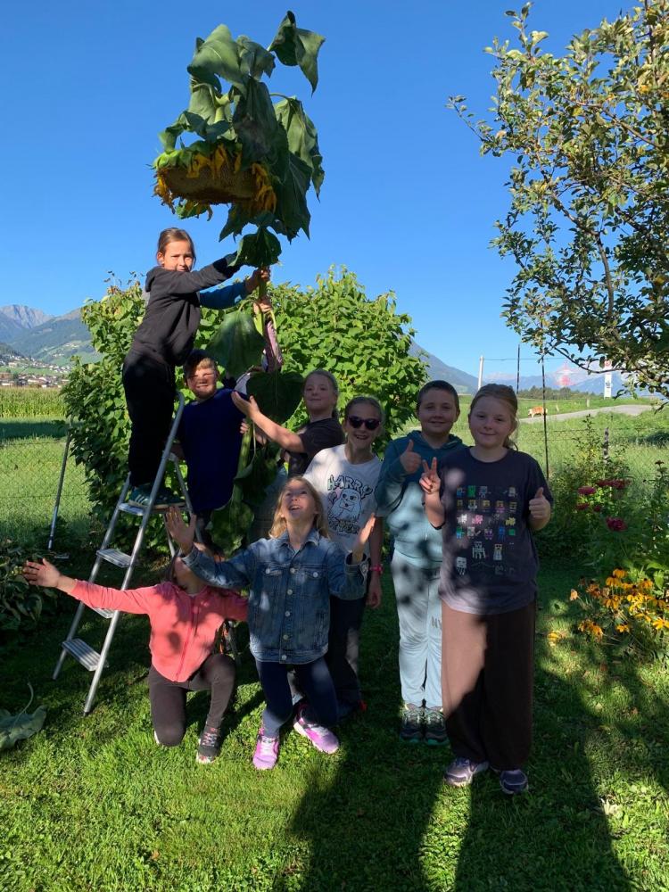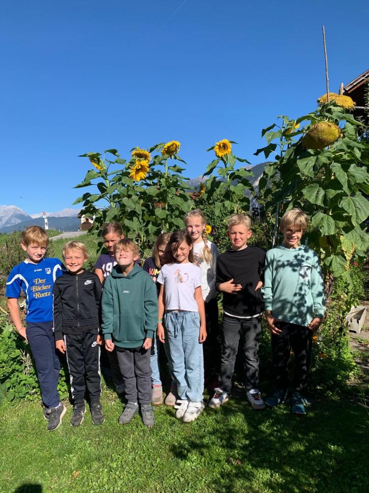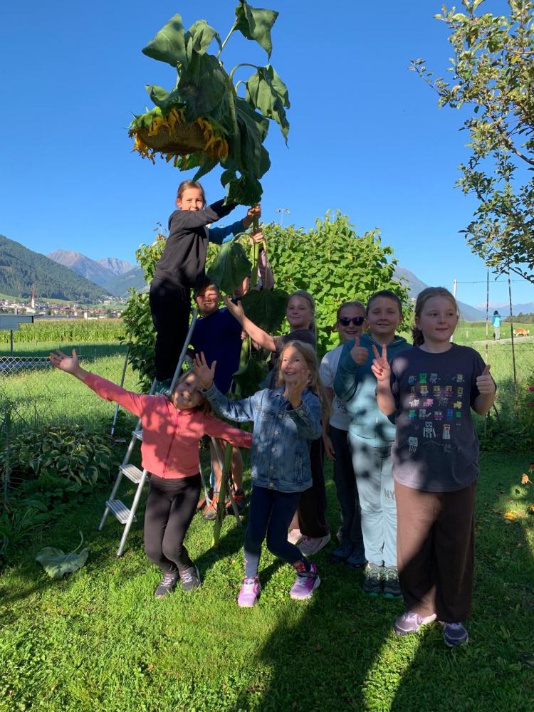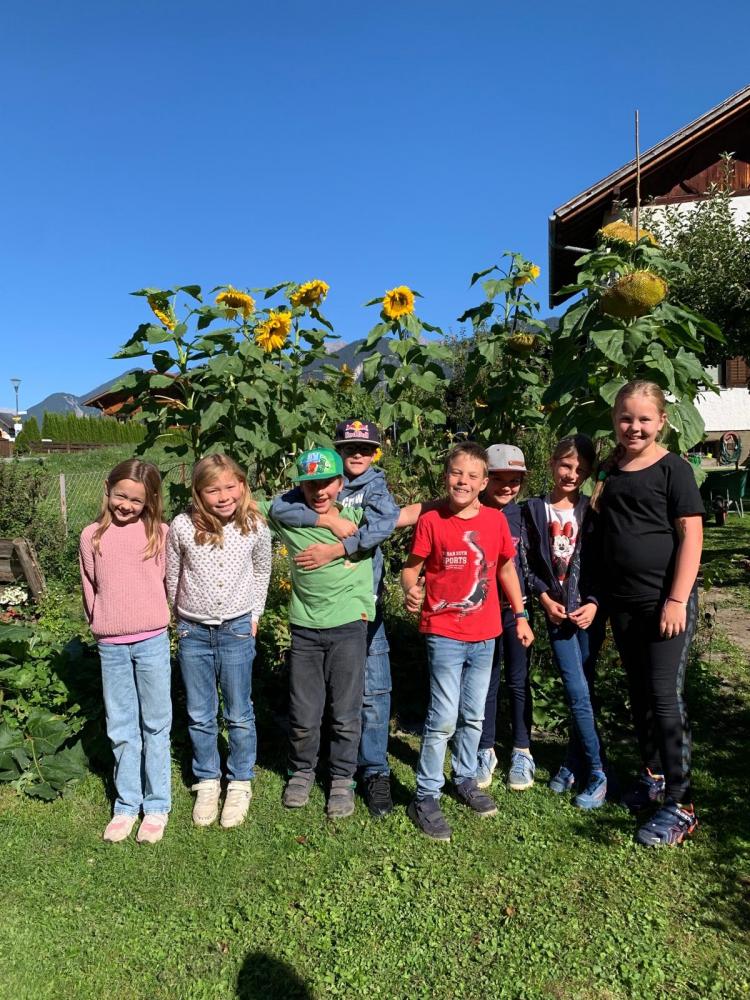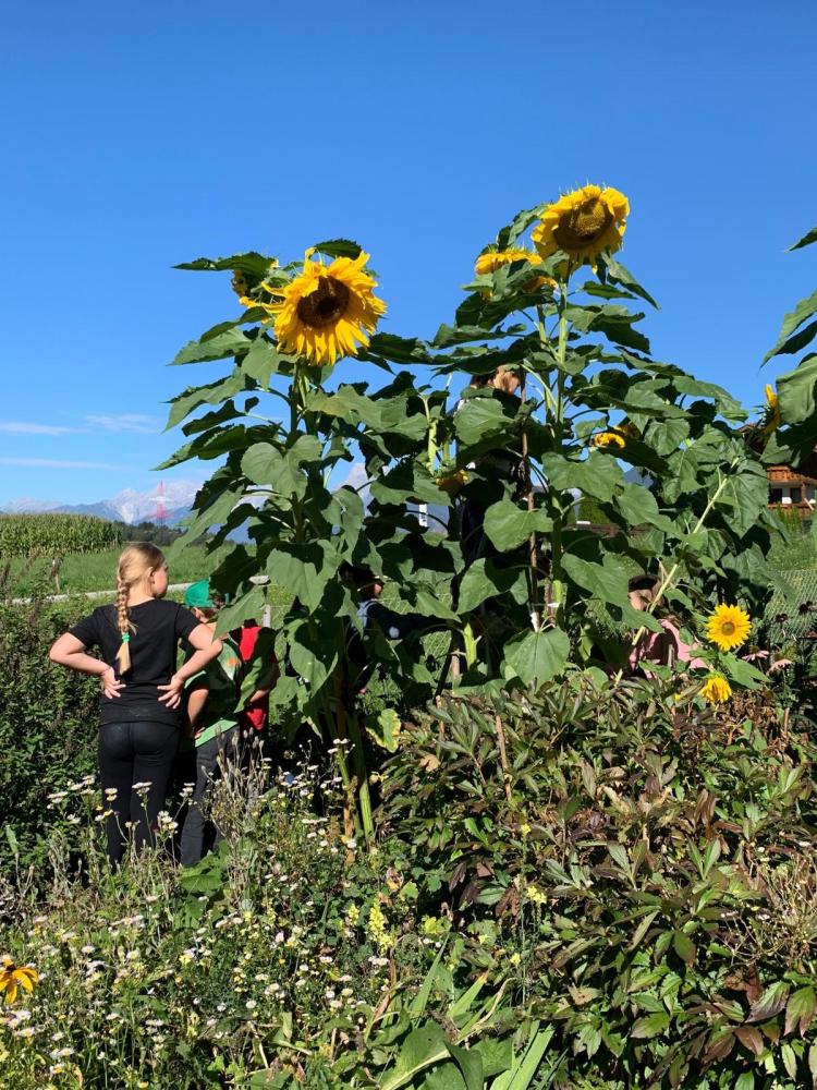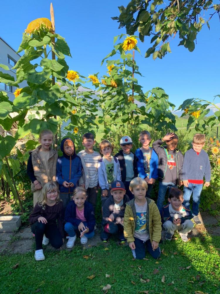 Gemeinsam mit Andrea Haid und Anja Köchl gingen wir in Gruppen zum Schulgarten. Dort angekommen staunten wir über die riesigen Sonnenblumen! Hast du gesehen WIE groß sie sind?
