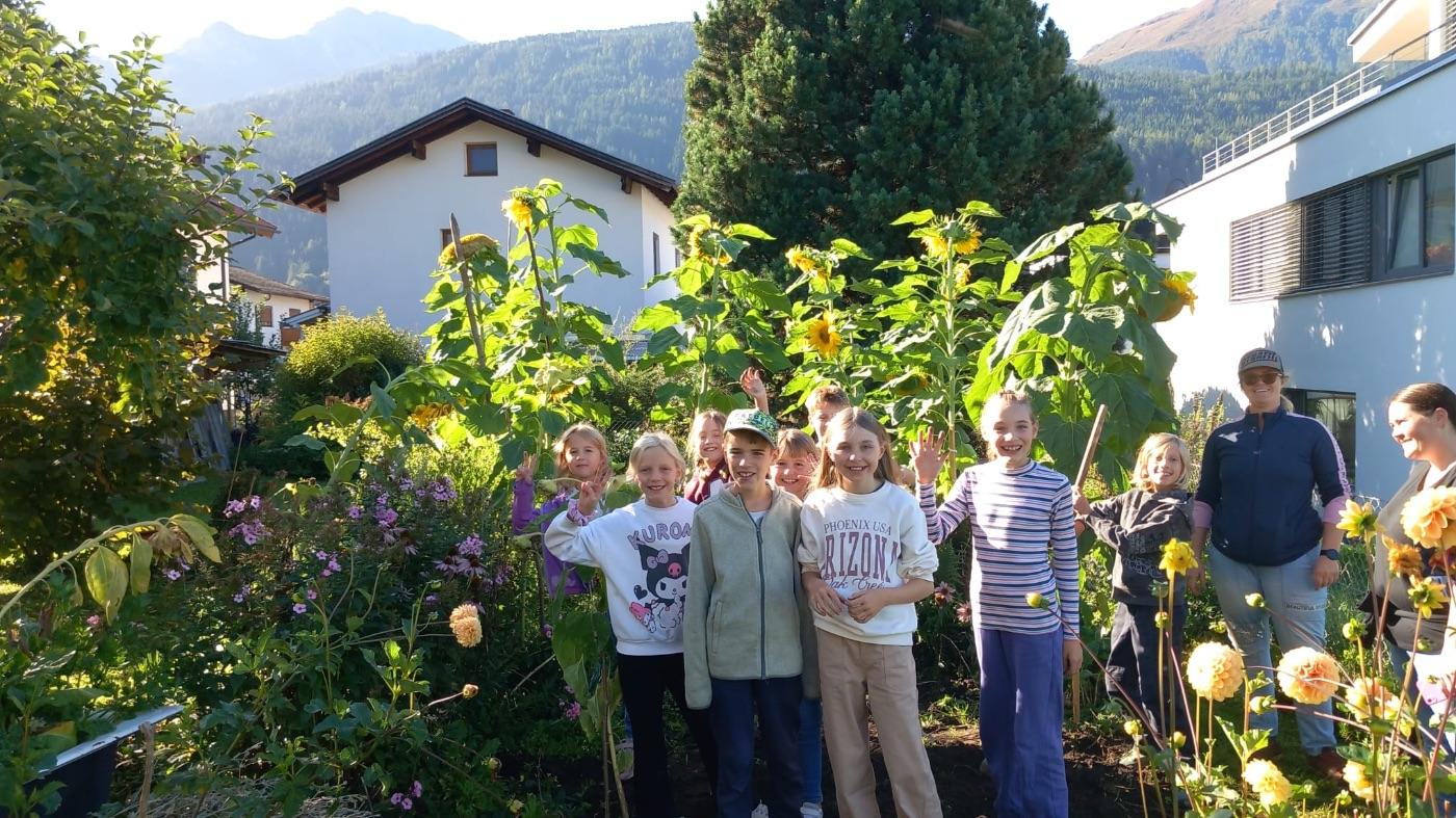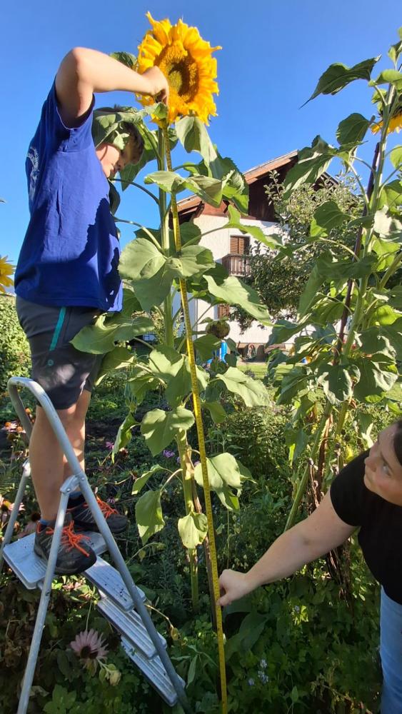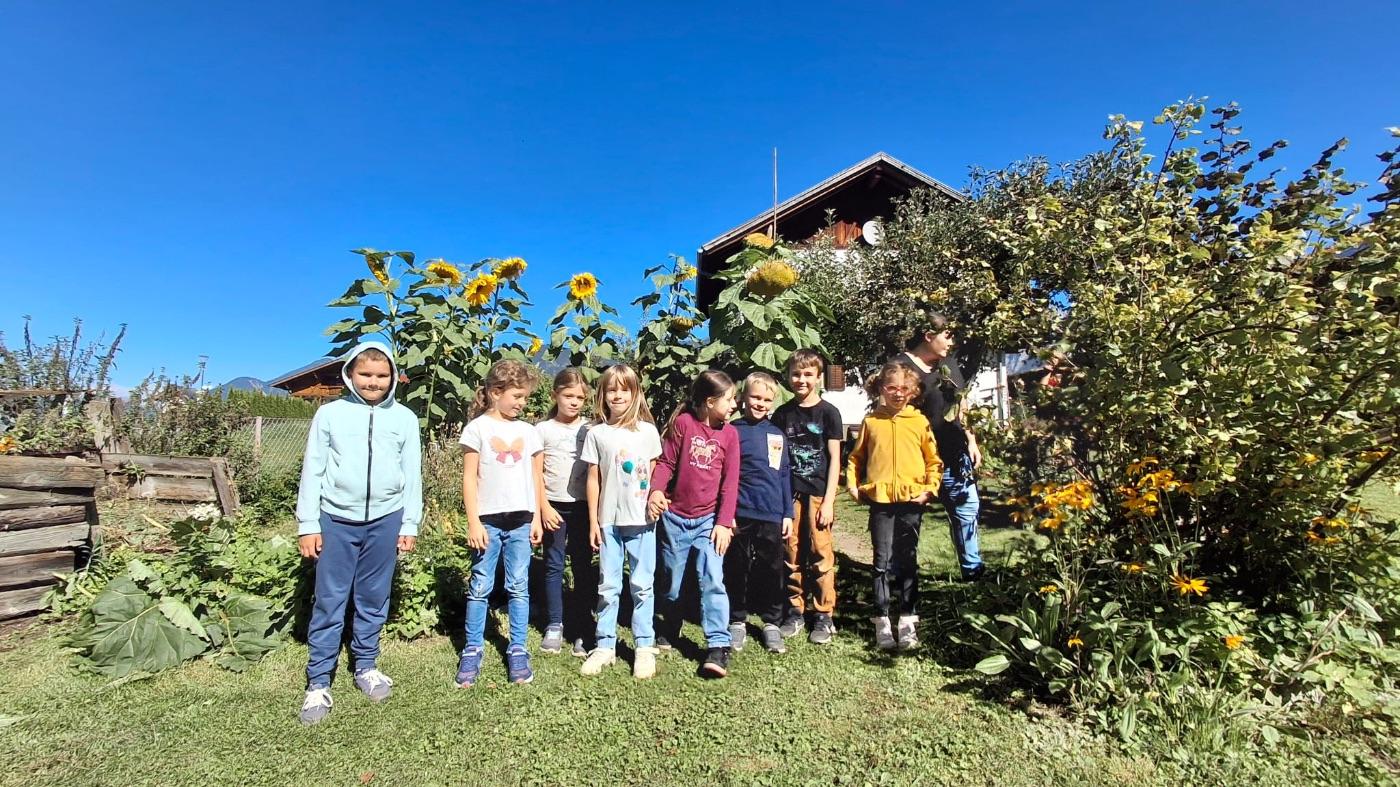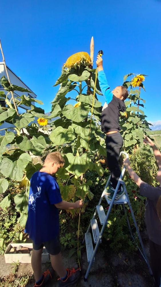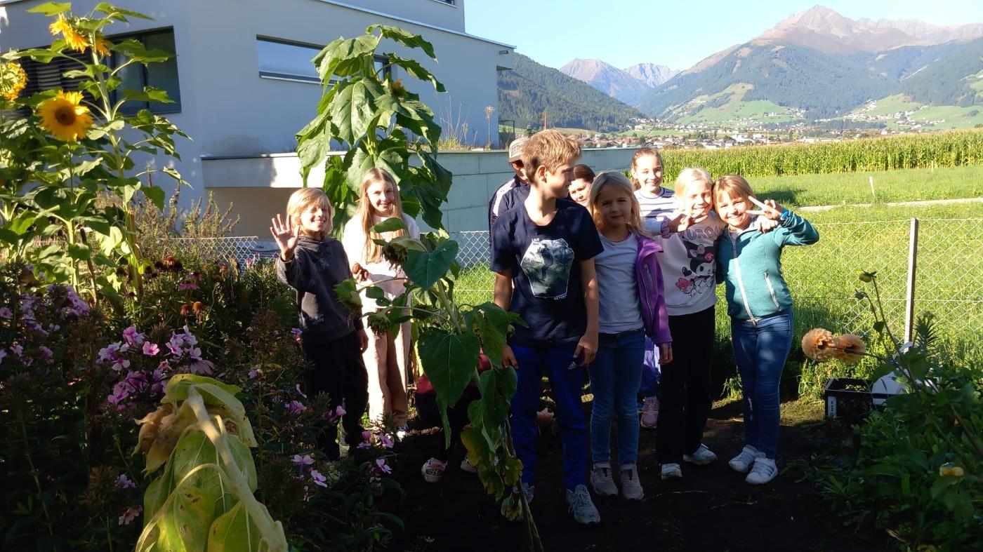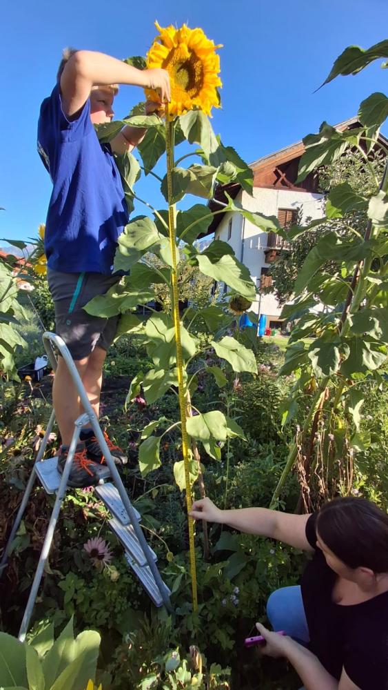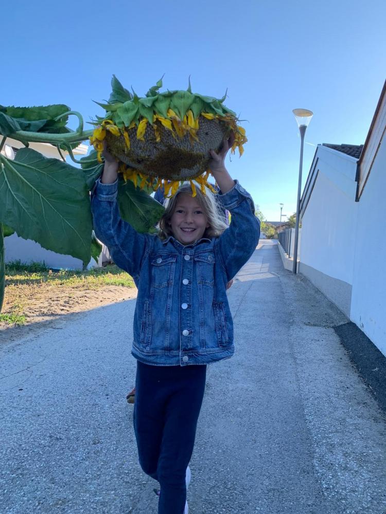 Gemeinsam mit Andrea Haid und Anja Köchl gingen wir in Gruppen zum Schulgarten. Dort angekommen staunten wir über die riesigen Sonnenblumen! Hast du gesehen WIE groß sie sind?