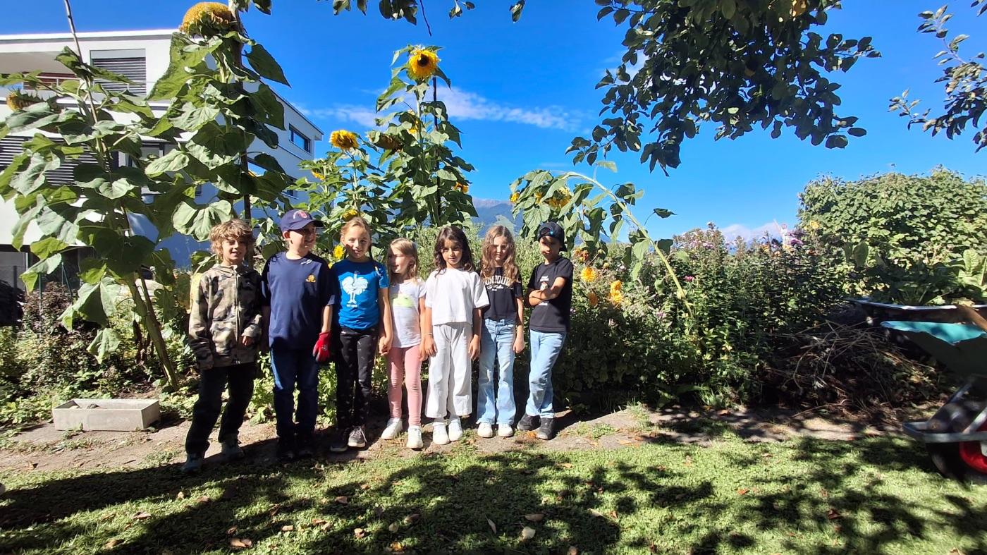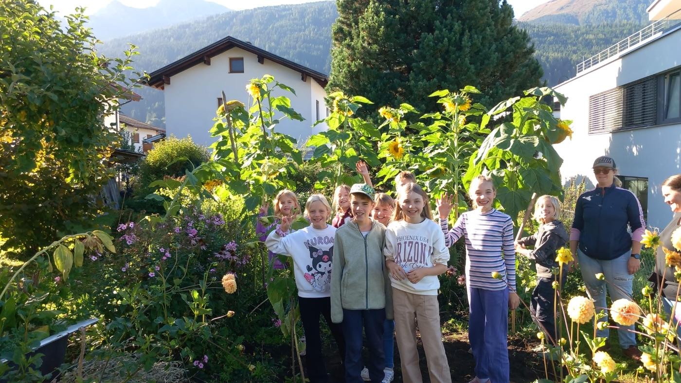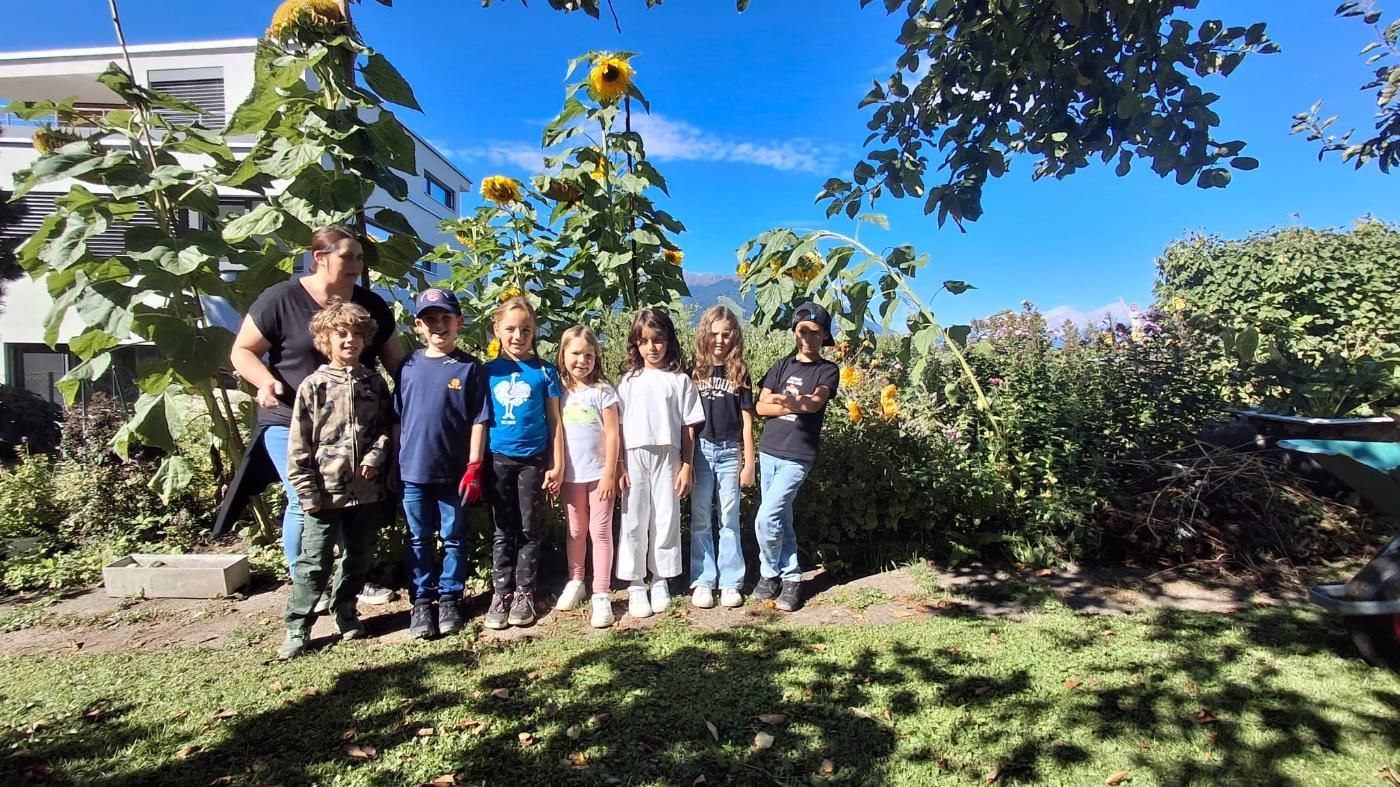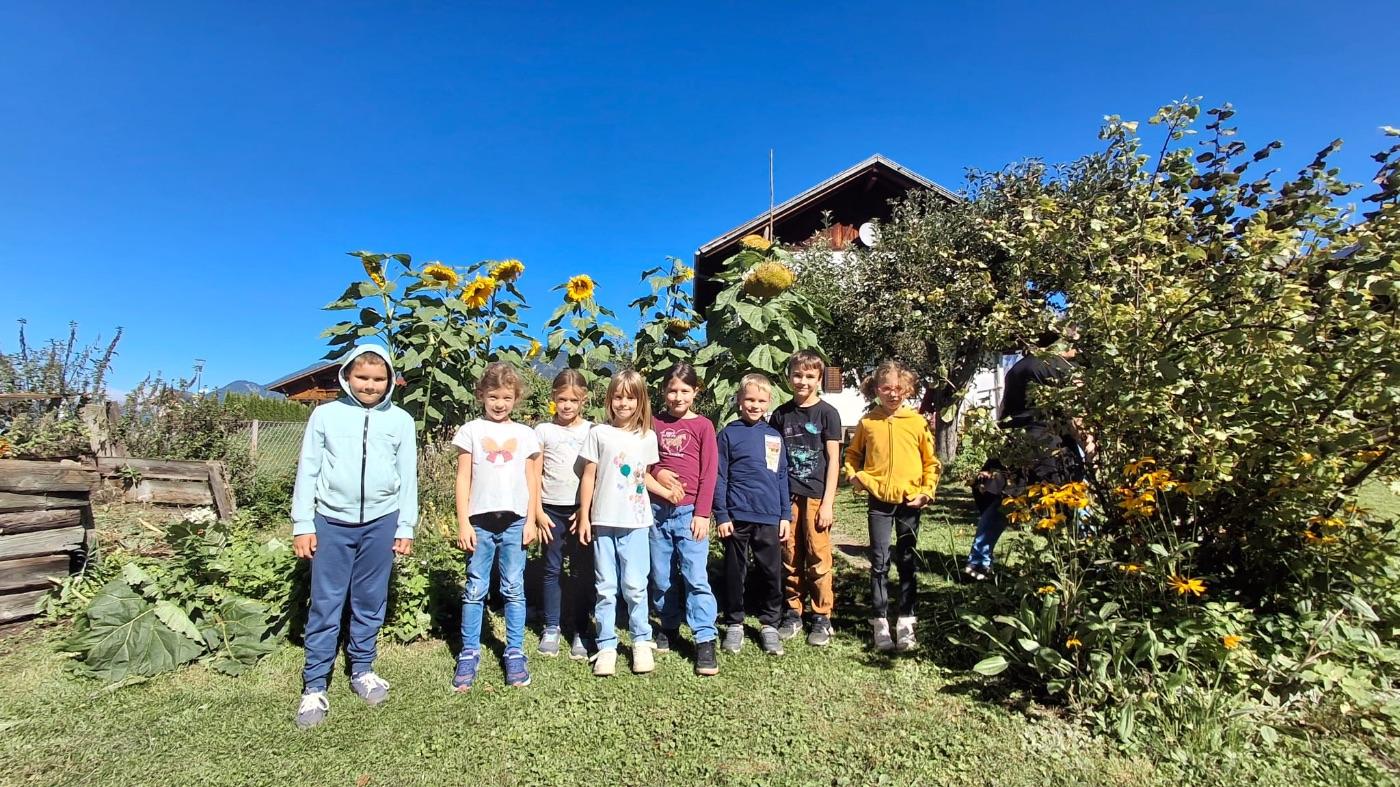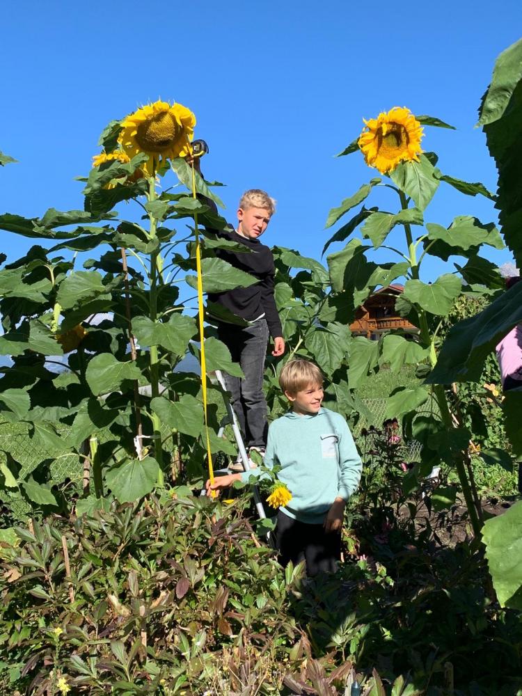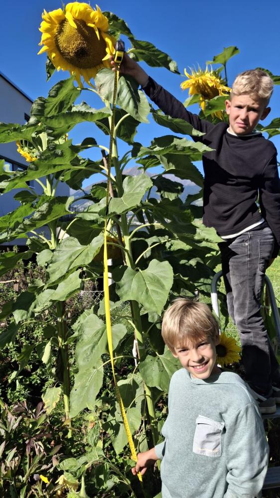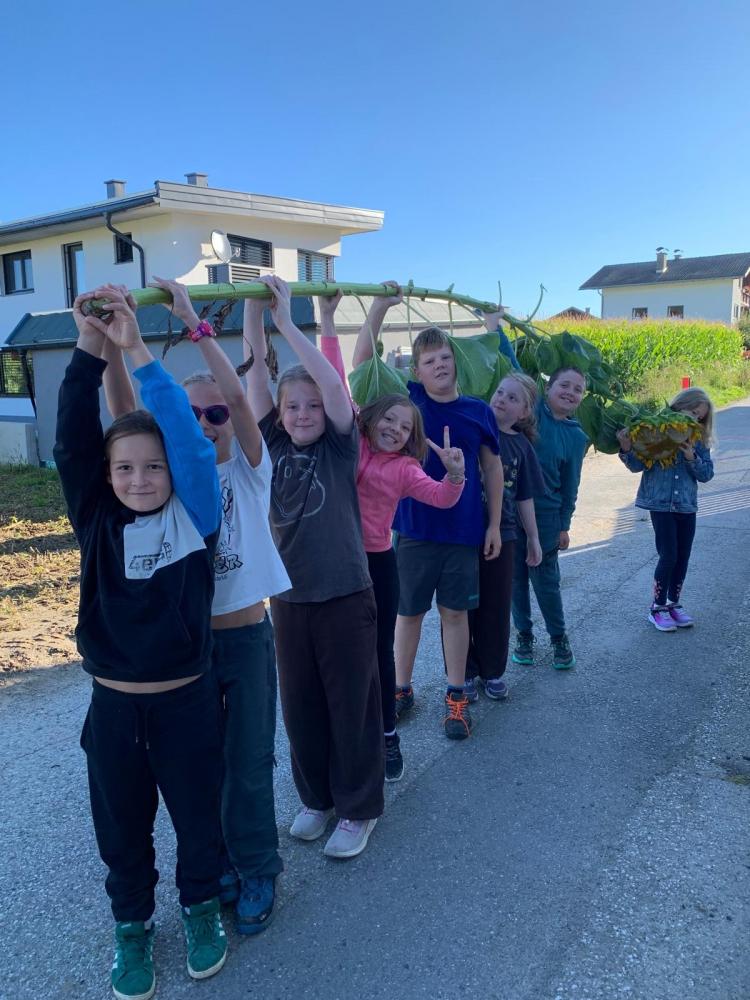 Gemeinsam mit Andrea Haid und Anja Köchl gingen wir in Gruppen zum Schulgarten. Dort angekommen staunten wir über die riesigen Sonnenblumen! Hast du gesehen WIE groß sie sind?