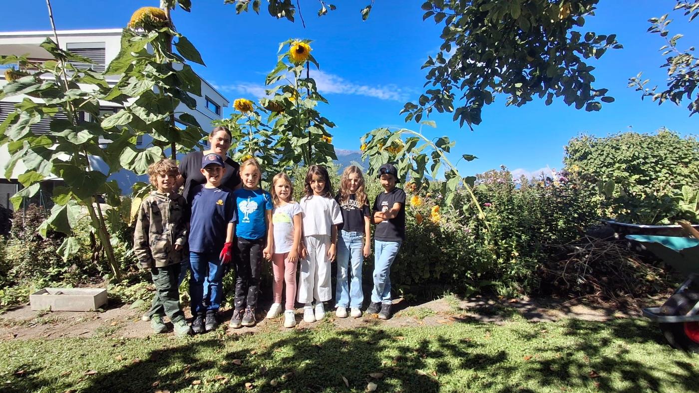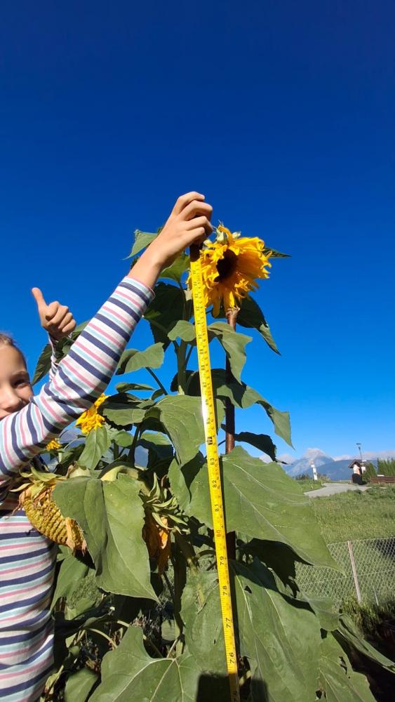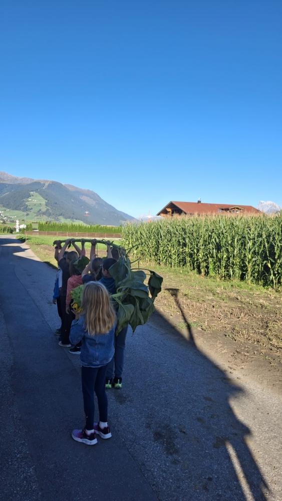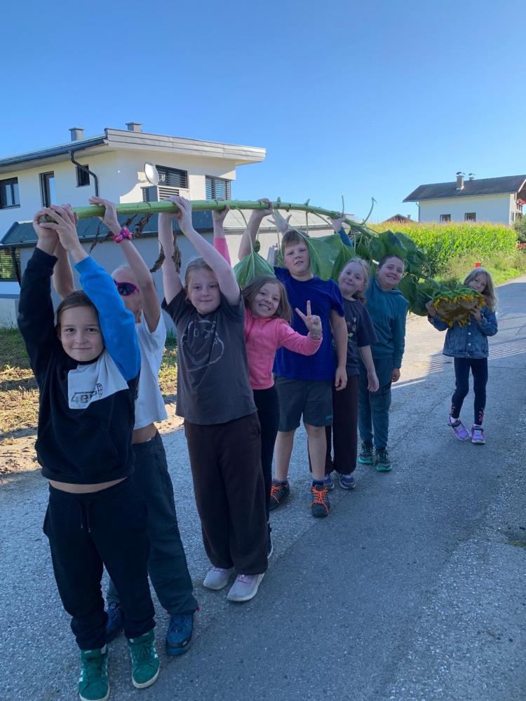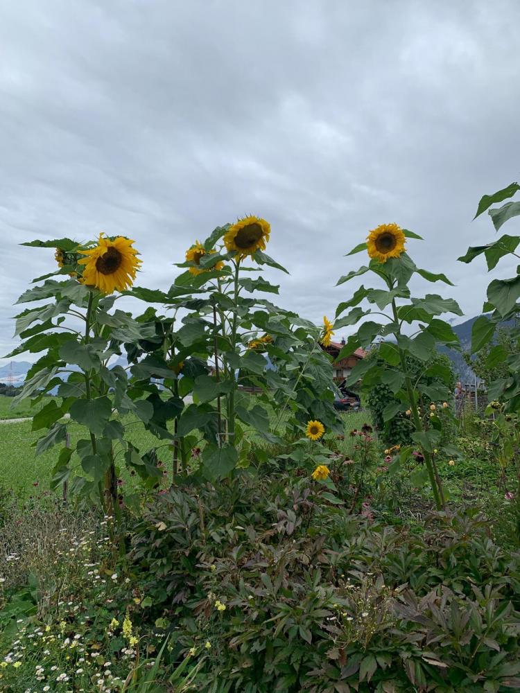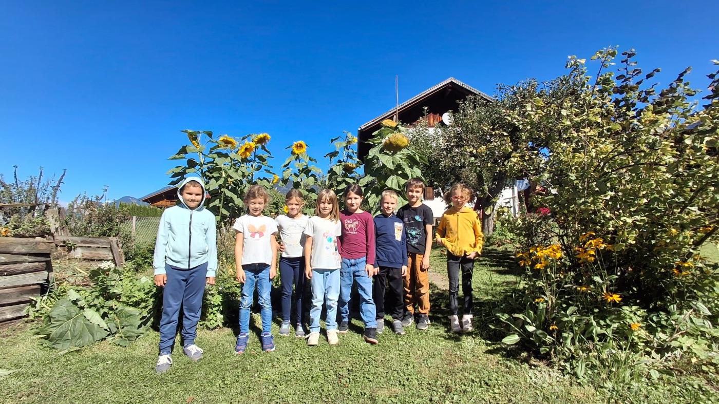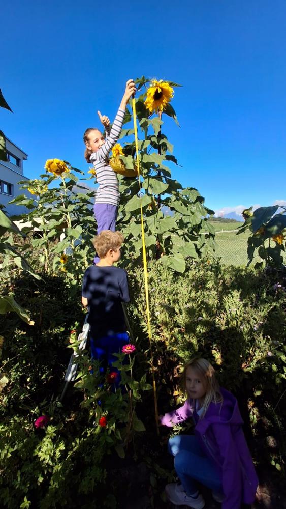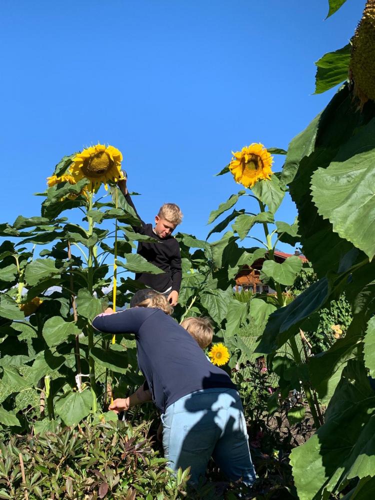 Gemeinsam mit Andrea Haid und Anja Köchl gingen wir in Gruppen zum Schulgarten. Dort angekommen staunten wir über die riesigen Sonnenblumen! Hast du gesehen WIE groß sie sind?