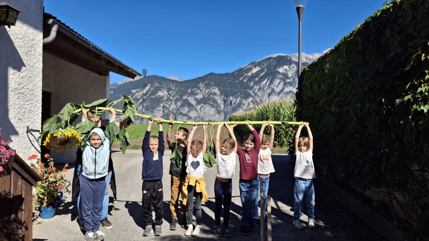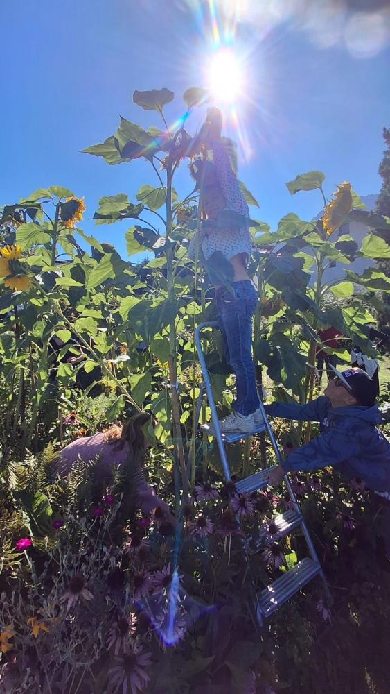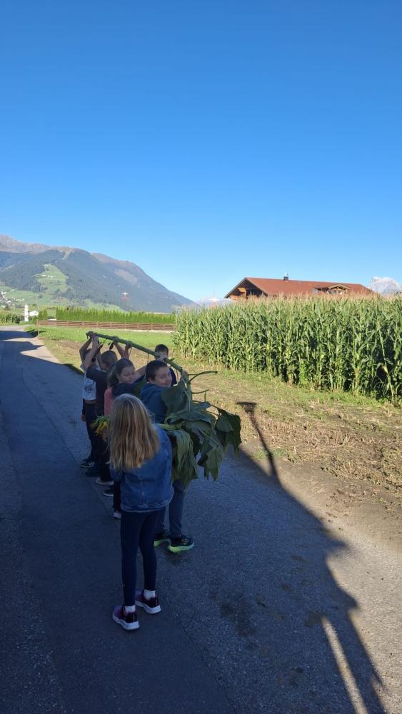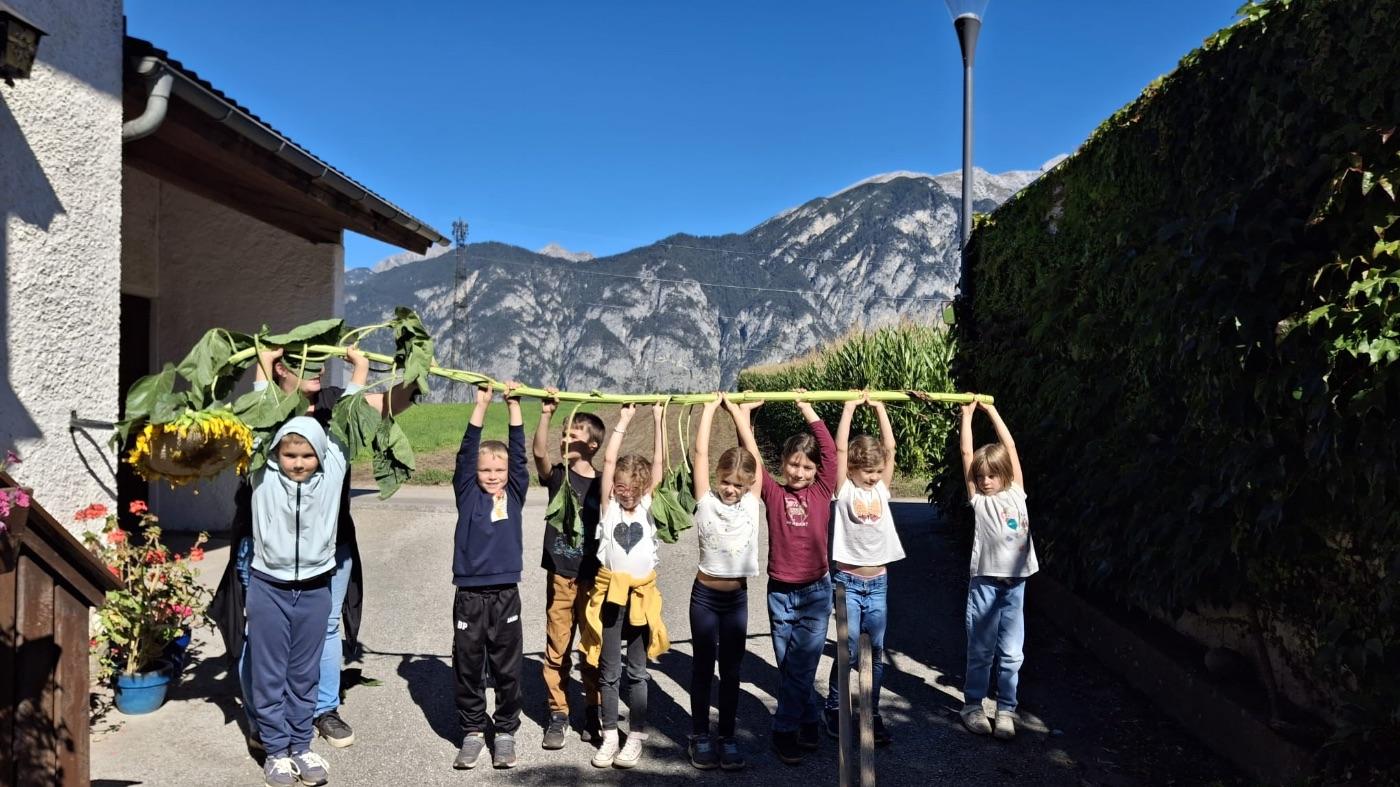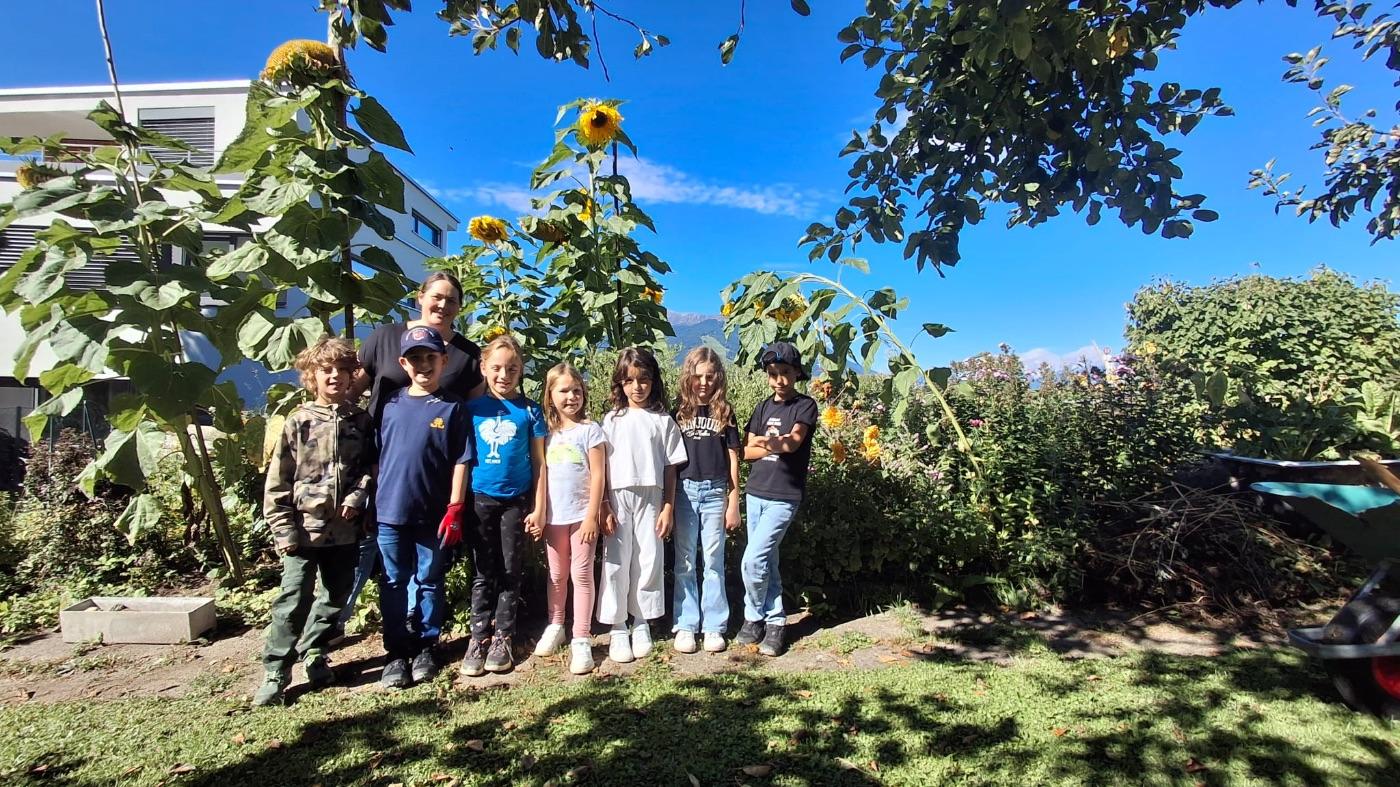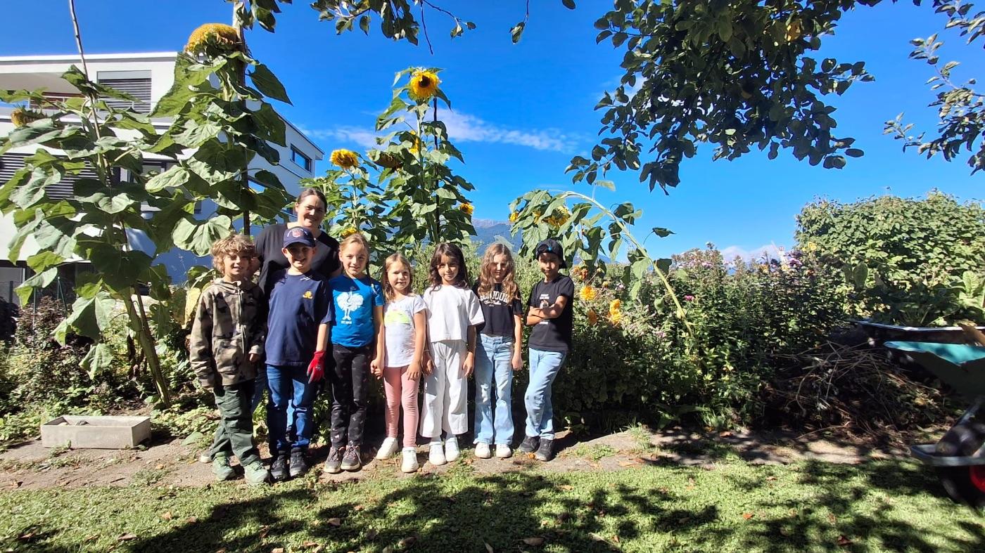 Gemeinsam mit Andrea Haid und Anja Köchl gingen wir in Gruppen zum Schulgarten. Dort angekommen staunten wir über die riesigen Sonnenblumen! Hast du gesehen WIE groß sie sind?