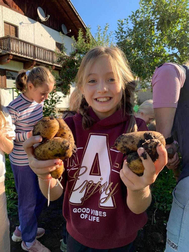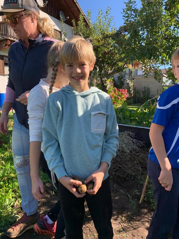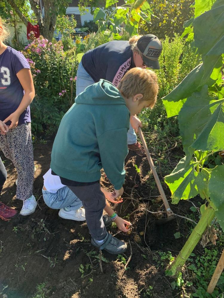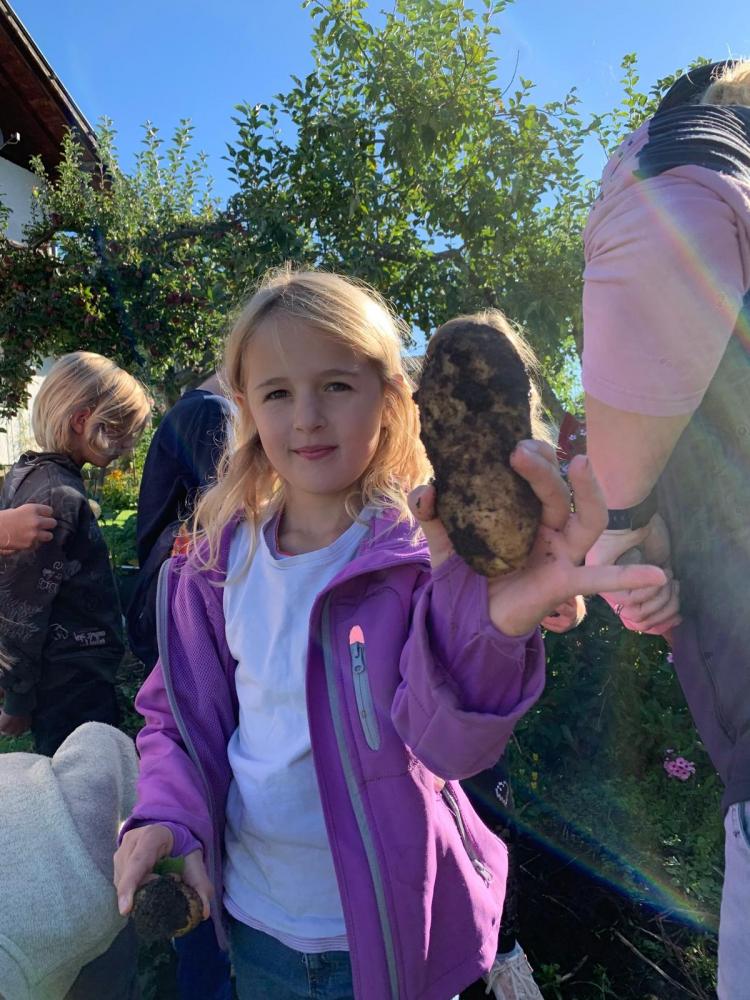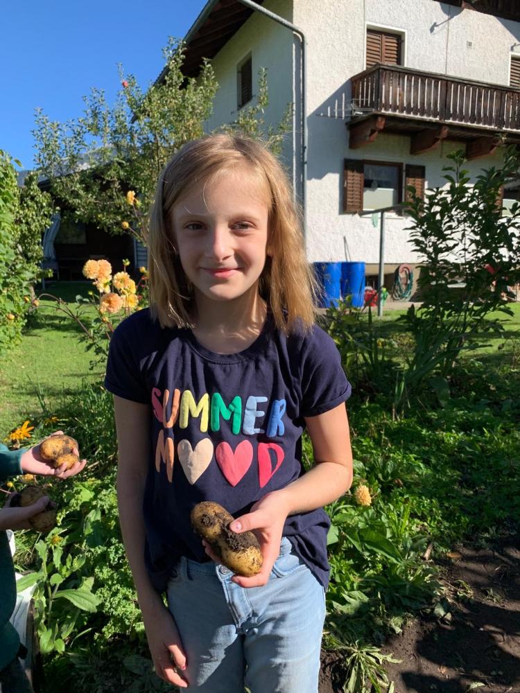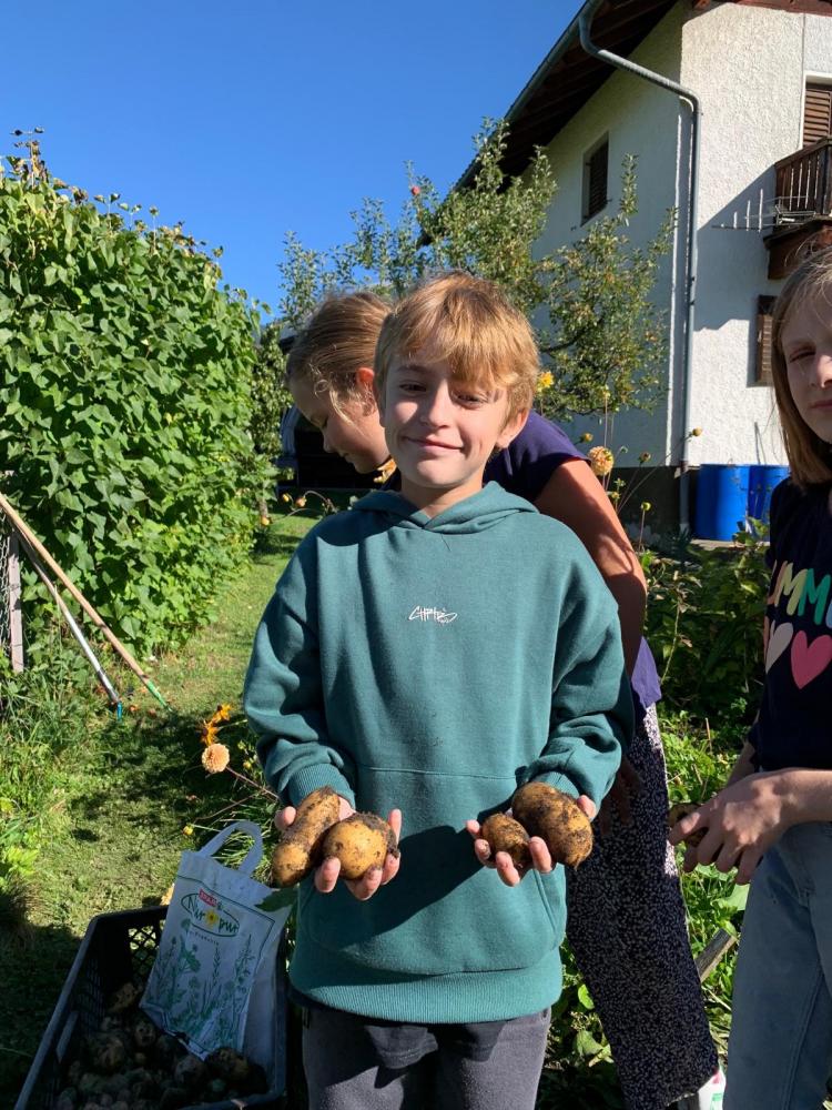 Nun aber zum Wesentlichen: Wir haben wieder alle Kartoffeln geerntet, für unser Kartoffelfest. Wühlend in der Erde, mit den Händen tief im Beet suchten wir nach den Erdäpfeln, um ja keinen zu übersehen.