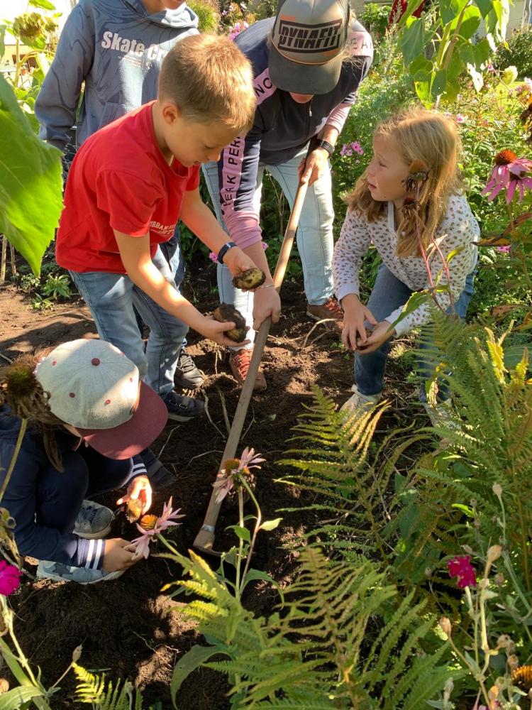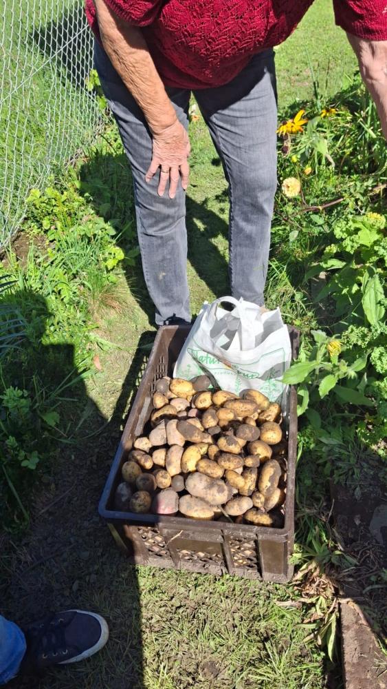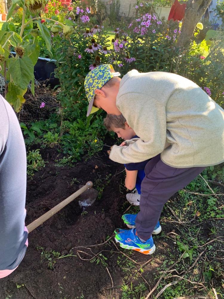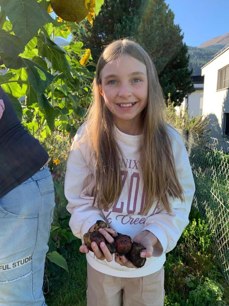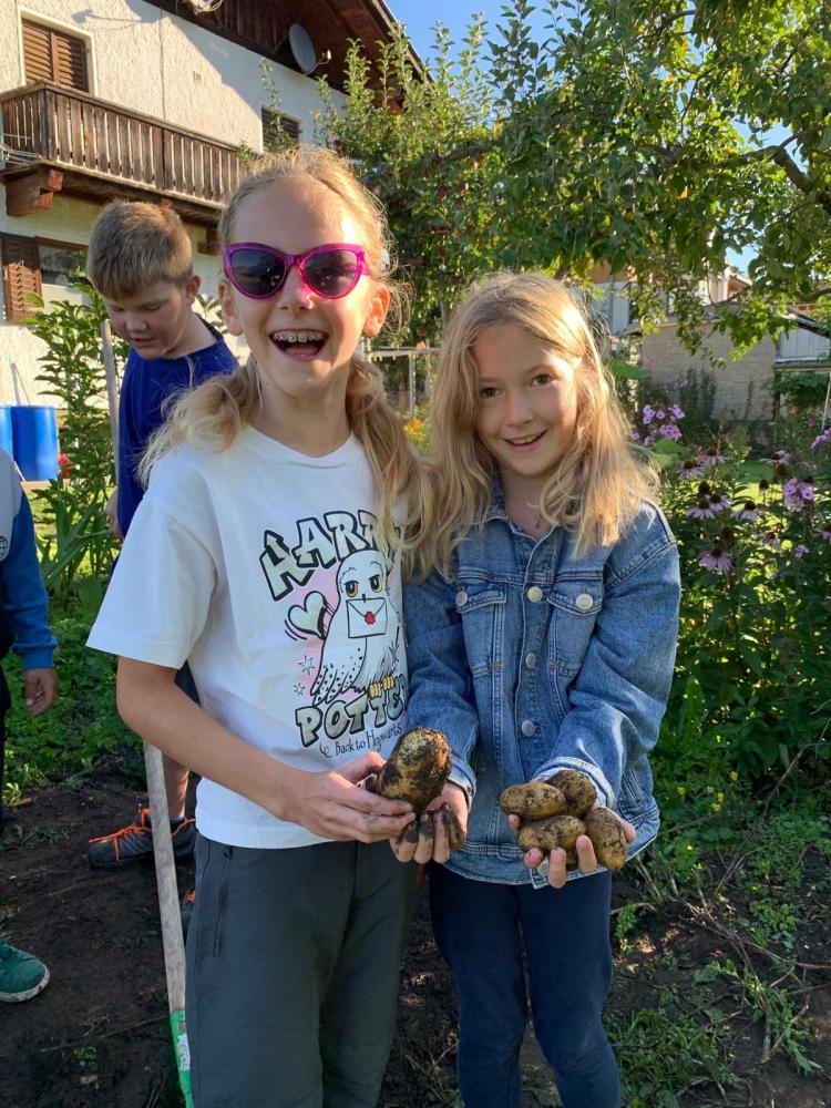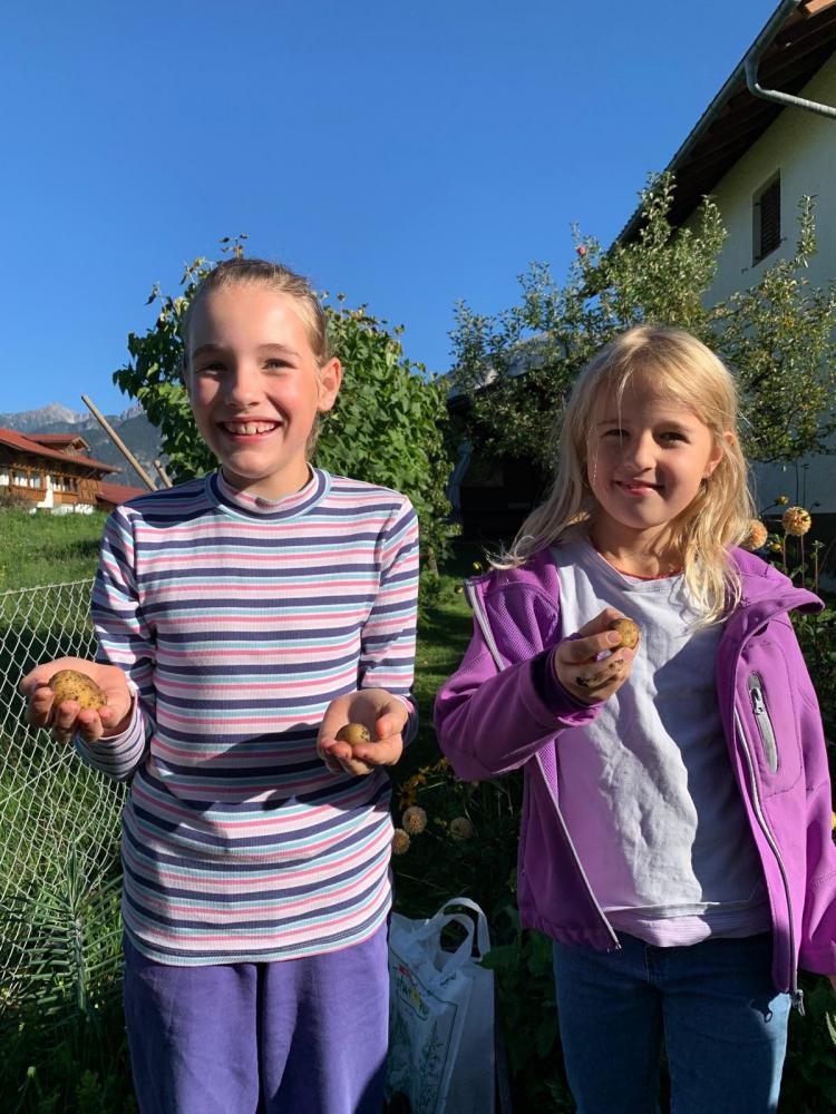 Nun aber zum Wesentlichen: Wir haben wieder alle Kartoffeln geerntet, für unser Kartoffelfest. Wühlend in der Erde, mit den Händen tief im Beet suchten wir nach den Erdäpfeln, um ja keinen zu übersehen.